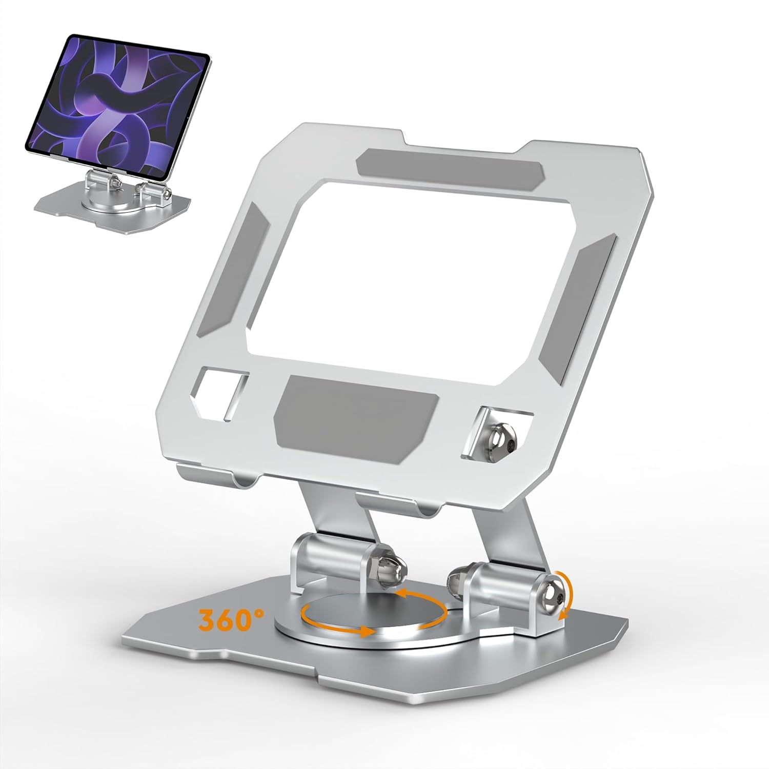 ✅【360° Rotating Base for Flexible Viewing】 – Equipped with a smooth 360-degree swivel base, this aluminium tablet stand allows you to effortlessly rotate your device between portrait and landscape modes, making it perfect for video calls, presentations, online classes, reading, and entertainment. The seamless rotation provides convenience for multitasking and sharing your screen with others without constantly moving the stand.