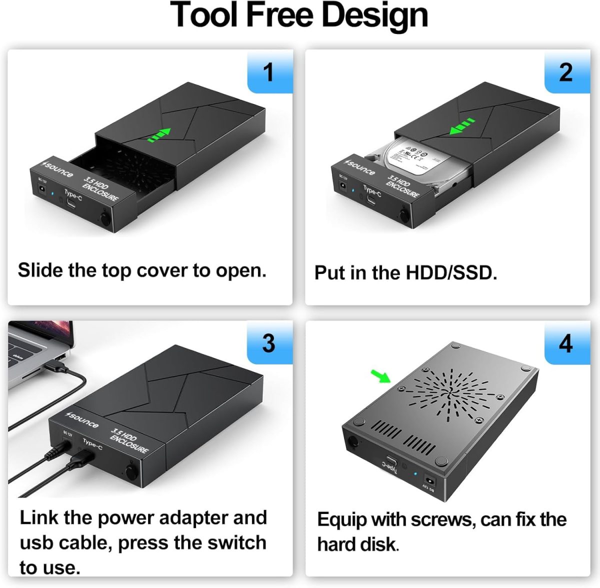 Sounce Type C Hard Drive Enclosure, External Hard Drive Docking Station for 3.5/2.5 Inch SATA Hard Drives/SSD with 16 TB+, Tool-Free HDD Enclosure 12V/2A Power Supply UASP (Black)