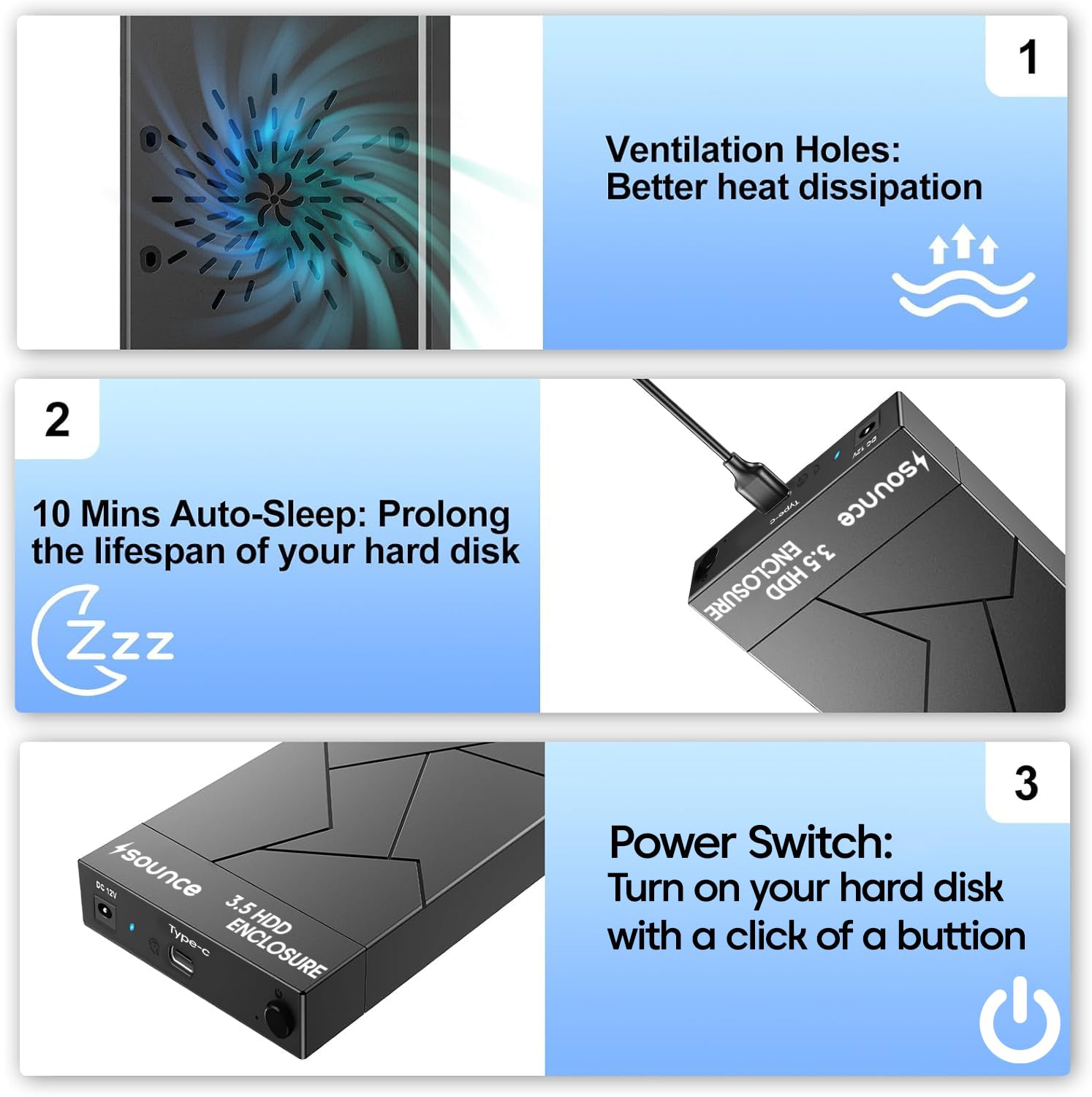 ✅【SUPER Fast Transfer Speed】: The Sounce Unit delivers data transfer rates of up to 5Gbps, significantly reducing wait times. With UASP technology, it maximizes the performance of your SATA III SSD/HDD when used with a compatible UASP-enabled host controller, ensuring efficient and swift data handling. Included are a USB-A 3.1 to A cable and a Type C 3.1 connector for enhanced connectivity.