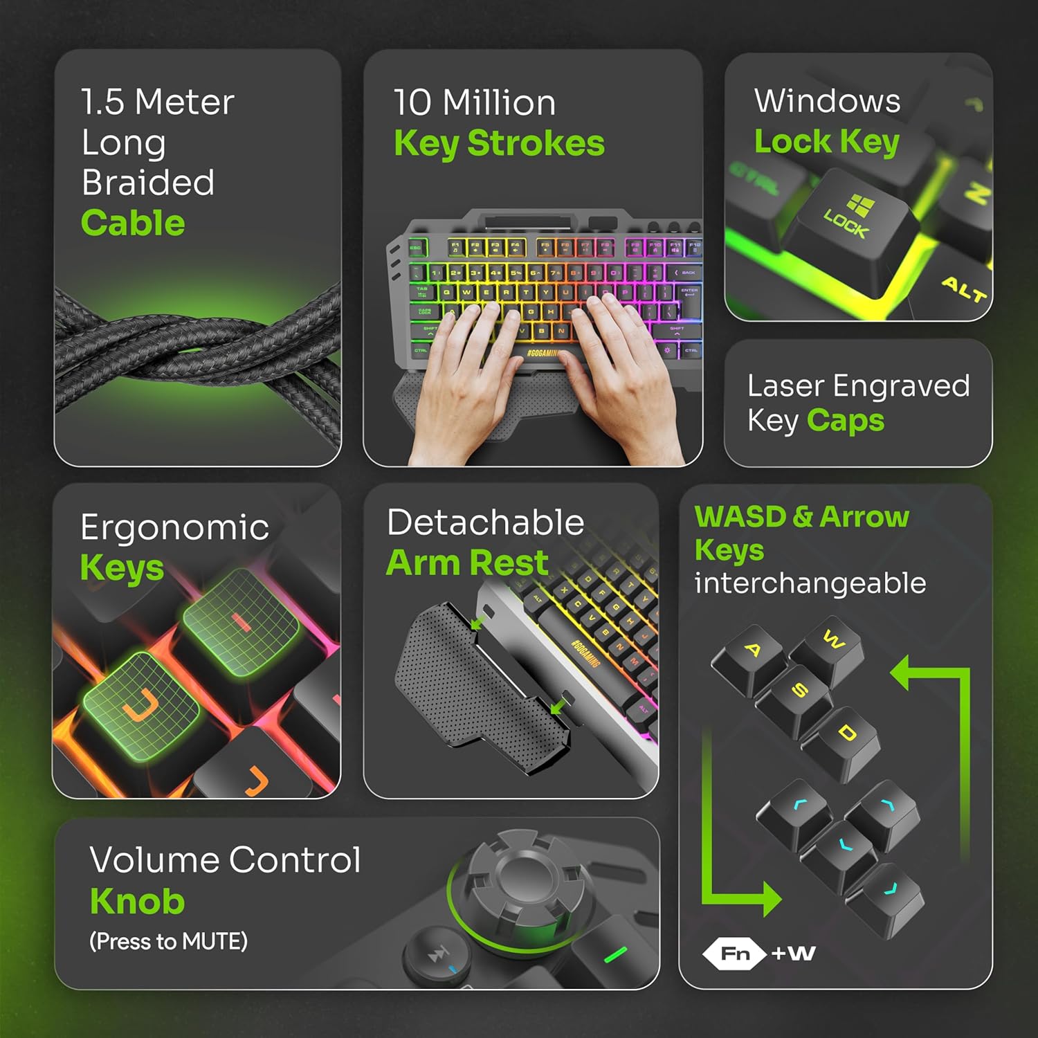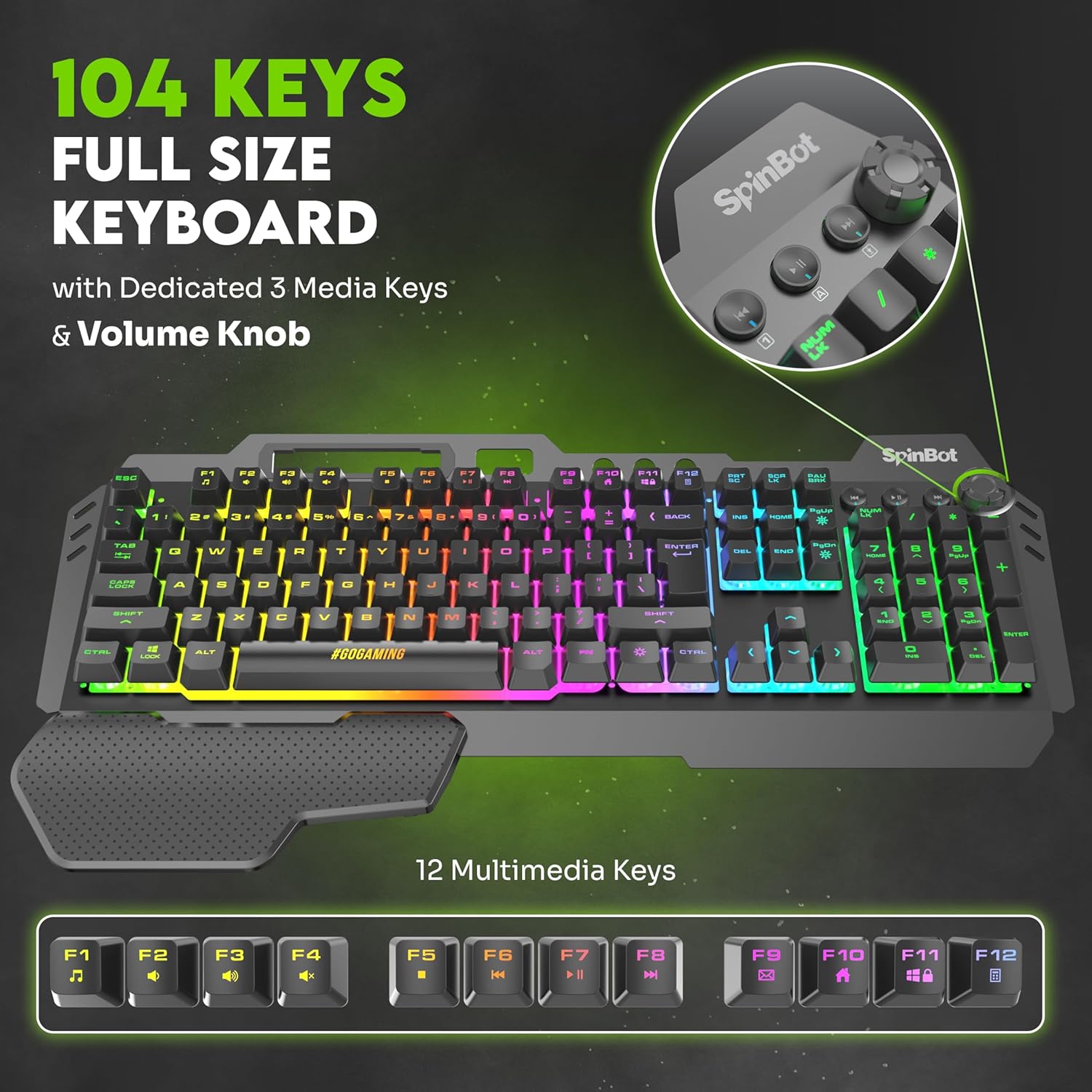 SpinBot Rage K20 LED Backlit|Metal Body|19 Anti-Ghosting Keys |Volume Control Knob| Wired USB Gaming Keyboard (Black)