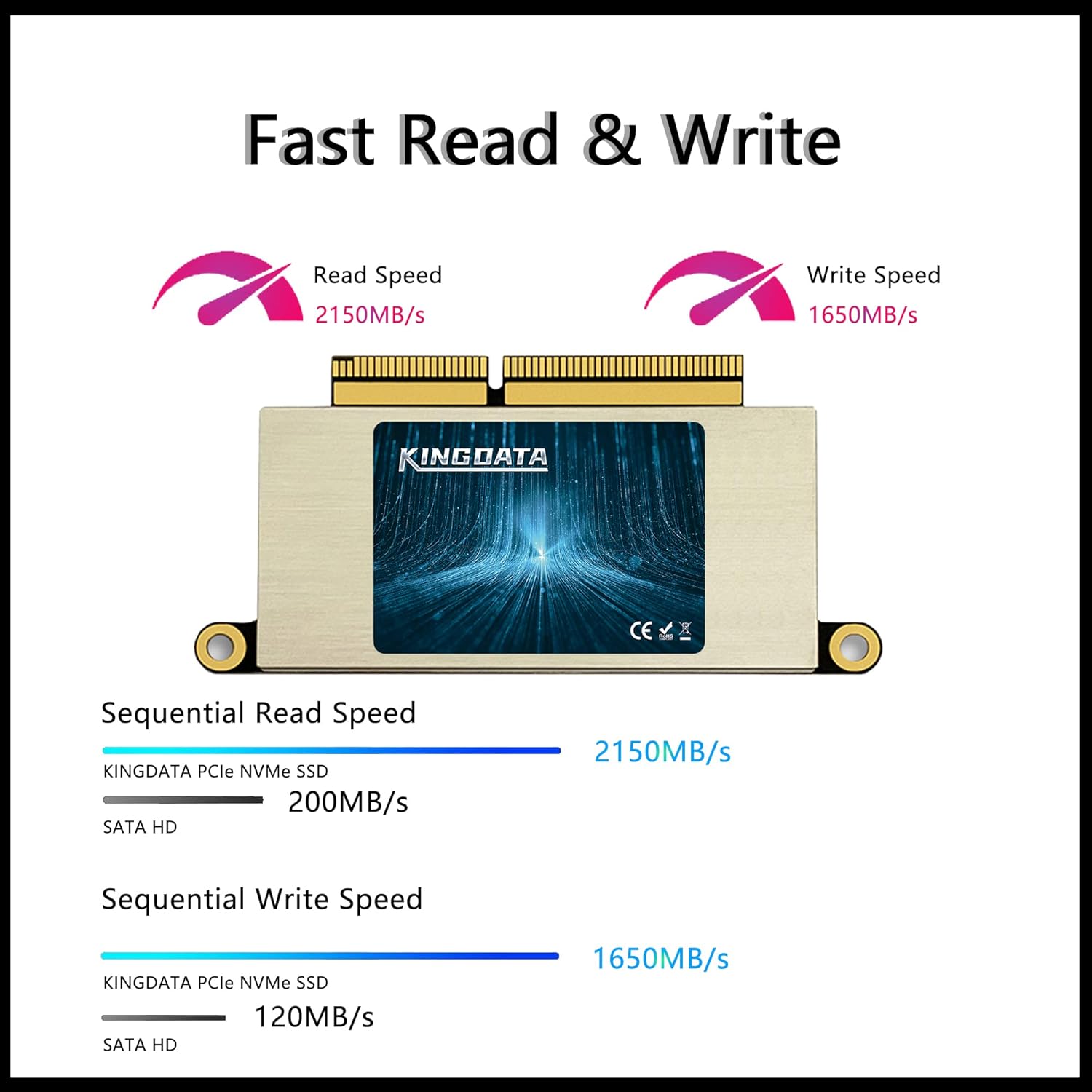 Our Macbook SSD is faster and more reliable. Based on PCIe Gen3*4, the read speed up to 2200MB/s and the write speed up to 2000MB/s. This means the programs launch and run more quickly, files are transferred faster, and you can do data-intensive work without worrying that your computer will stall or freeze.