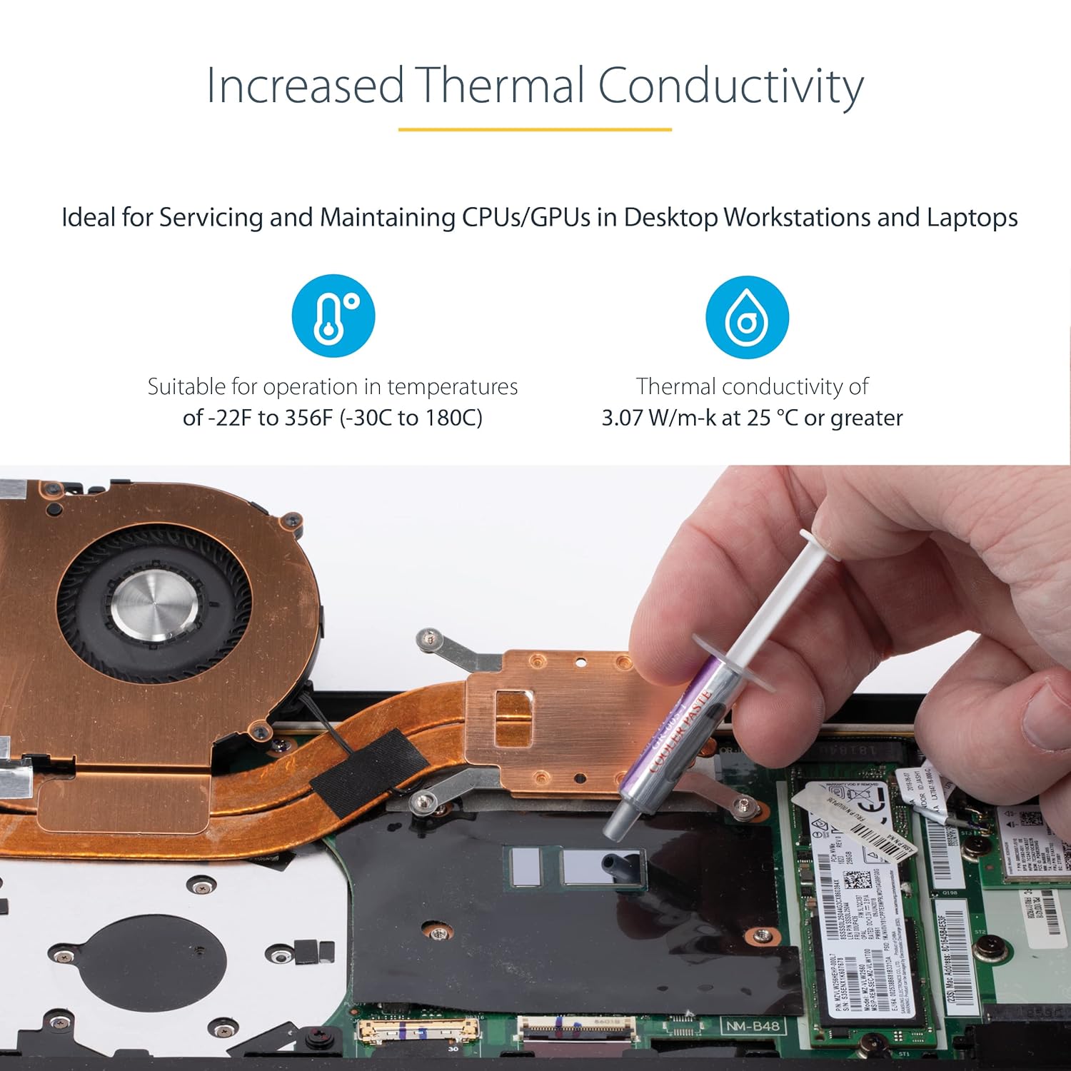 This 5-Pack of thermal paste works with a heat sink to improve heat dissipation from integrated circuits (ICs), like CPUs, GPUs and other computer chips. The thermal paste features CE and RoHS certifications so you can rest assured it’s safe for its intended use. High-Performance Thermal Paste The thermal paste, also known as silver grease, is a metal based (metal oxide) compound that contains 50% silicone, 30% carbon and 20% metal oxide to offer better thermal conductivity than standard heat transfer pastes with negligible electrical conductivity. The thermal paste/glue is suitable for operation in temperatures of -22°F to 365°F (-30°C to 180°C) with thermal conductivity of 3.07 W/m-K at 25 °C or greater. This performance makes the compound ideal for servicing & maintaining workstations, desktop computers and servers. Conveniently Sized 1.5g Tubes Each tube included in this five pack contains 1.5g of paste, sufficient for 4 to 6 applications, for 20 to 30 applications in total. Each unit is packaged in a syringe for easy application, that’s re-sealable to prevent the product from drying between use. Plus, five included units make it ideal for distribution to different workstations throughout the work place. SILV5-THERMAL-PASTE is backed by a StarTech 2-year warranty, including free lifetime 24/5 multi-lingual, North American based, technical assistance.