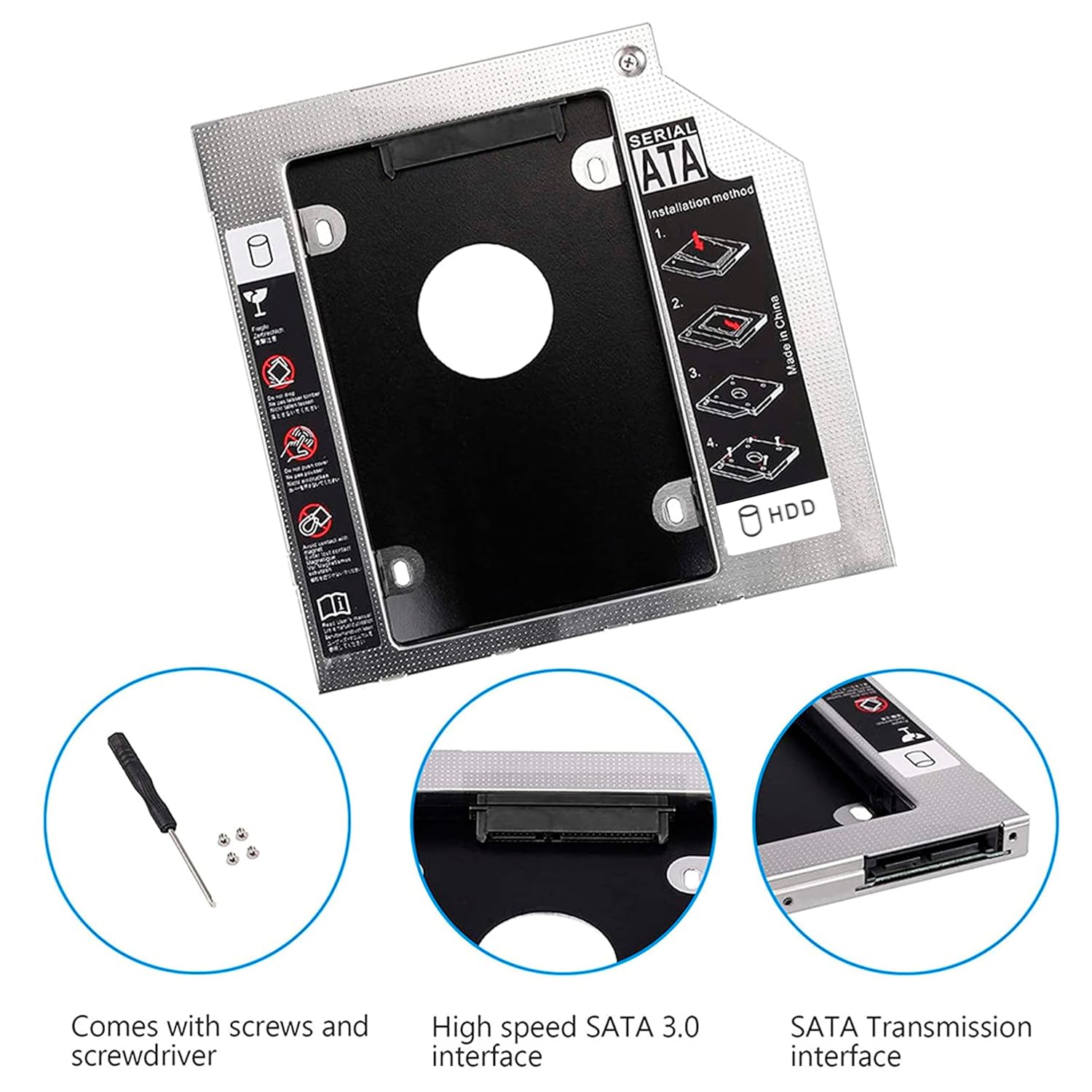Compatible with: 2.5″/12.7mm SATA HDD or SSD, hard drive not include. 100 percent brand new 12.7 mm-thick caddyFully integrated into laptop, no cables/PSU/software driver needed. Fast & reliable connection in laptop, just as the primary HDD9.5mm laptop optical drive bay SATA interface Suitable for SATA 2.5″ hard drives (thickness less than 9.5mm thickness) Removable front panel, can replace with your current panel.