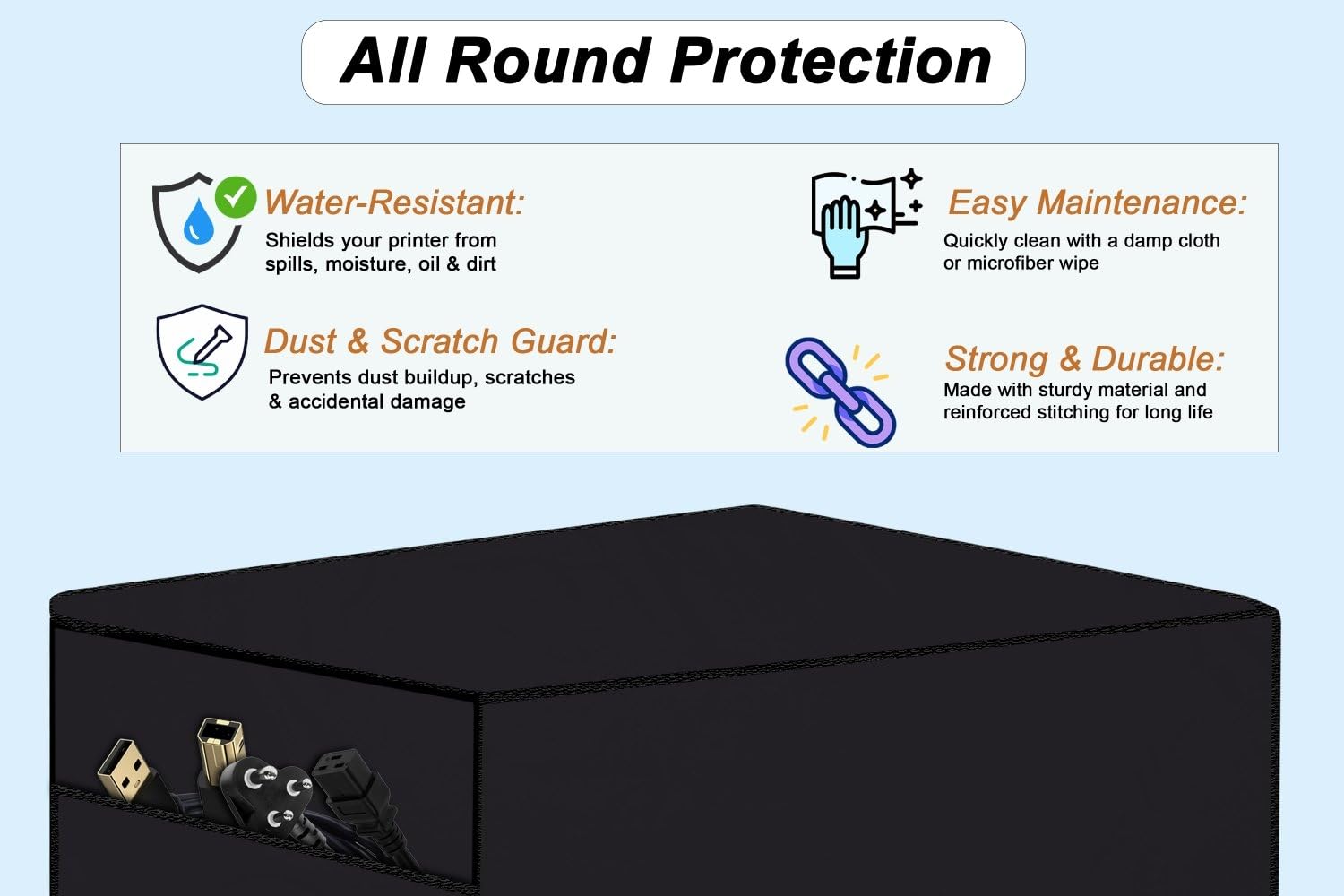 Waterproof and Dustproof Printer Cover Protect your printer from Dust, water spills, stains, and scratches. Crafted from premium Polyester fabric with a waterproof lining, it ensures your printer stays dry and clean even in humid or dusty environments. Keep your printer new while improving its performance and longevity. Ideal for households, small offices, and professionals who want hassle-free printer maintenance and long-term protection. Whether you want to shield it from accidental water splashes, dust buildup, or scratches, this cover is a must-have accessory for every printer owner.