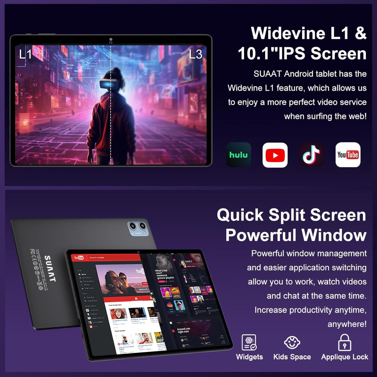 HD Screen: 10.1 inch 1280 x 800 IPS HD screen allows you to enjoy a more realistic and bright color impact. With Widevine L1 certification, you will have a high-quality video playback experience