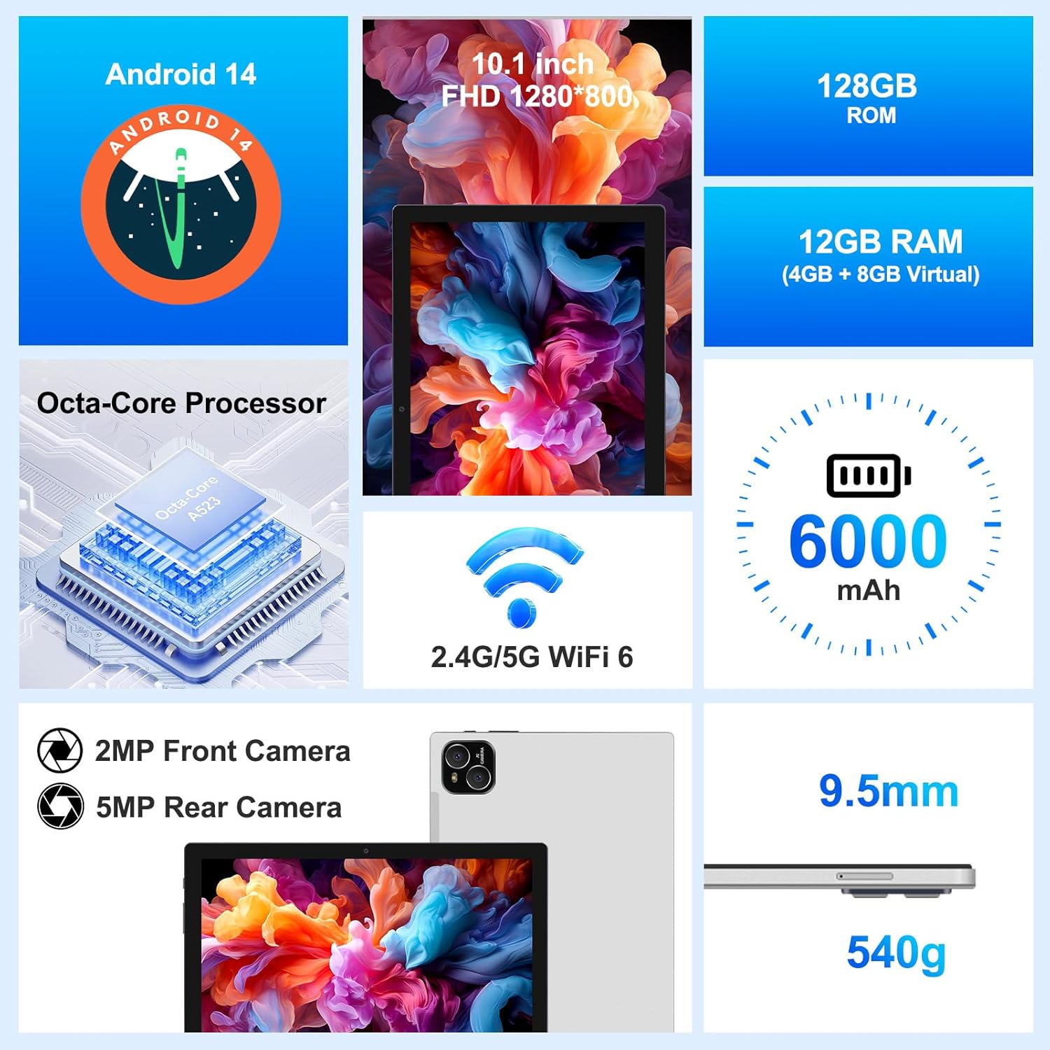 This Android 14 tablet has 12GB (4+8 expansion) RAM + 128GB ROM, 1TB expandable, which can store more games, movies, videos, music and work software for you, and supports Netflix, Facebook, Tik Tok, Youtube and other software. You can play more comfortably, download and view rich movies, and accommodate huge work files.
