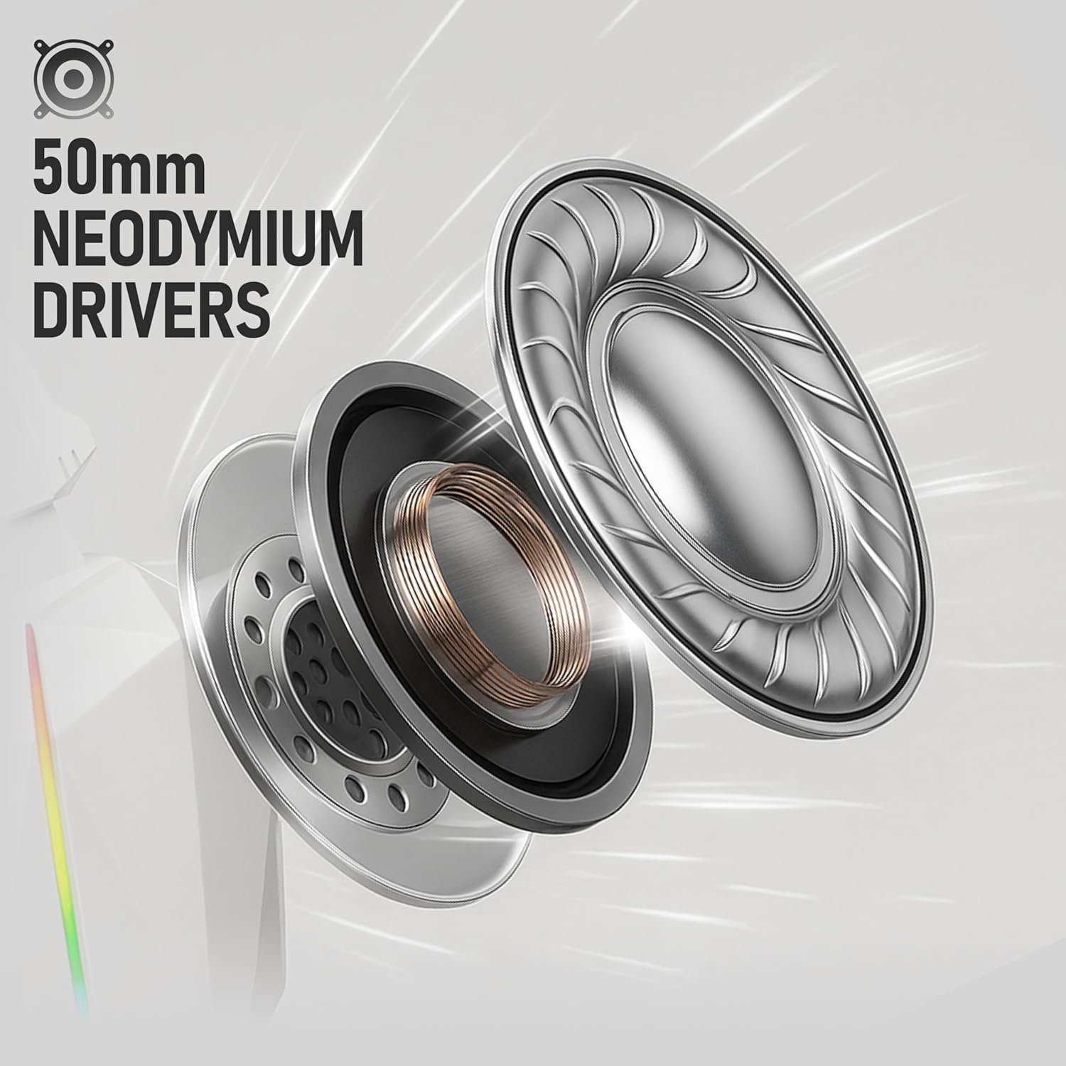 Powerful 50mm Drivers: Deliver immersive, high-fidelity audio with deep bass and clear treble, enhancing every detail in games, music, movies, and streaming.