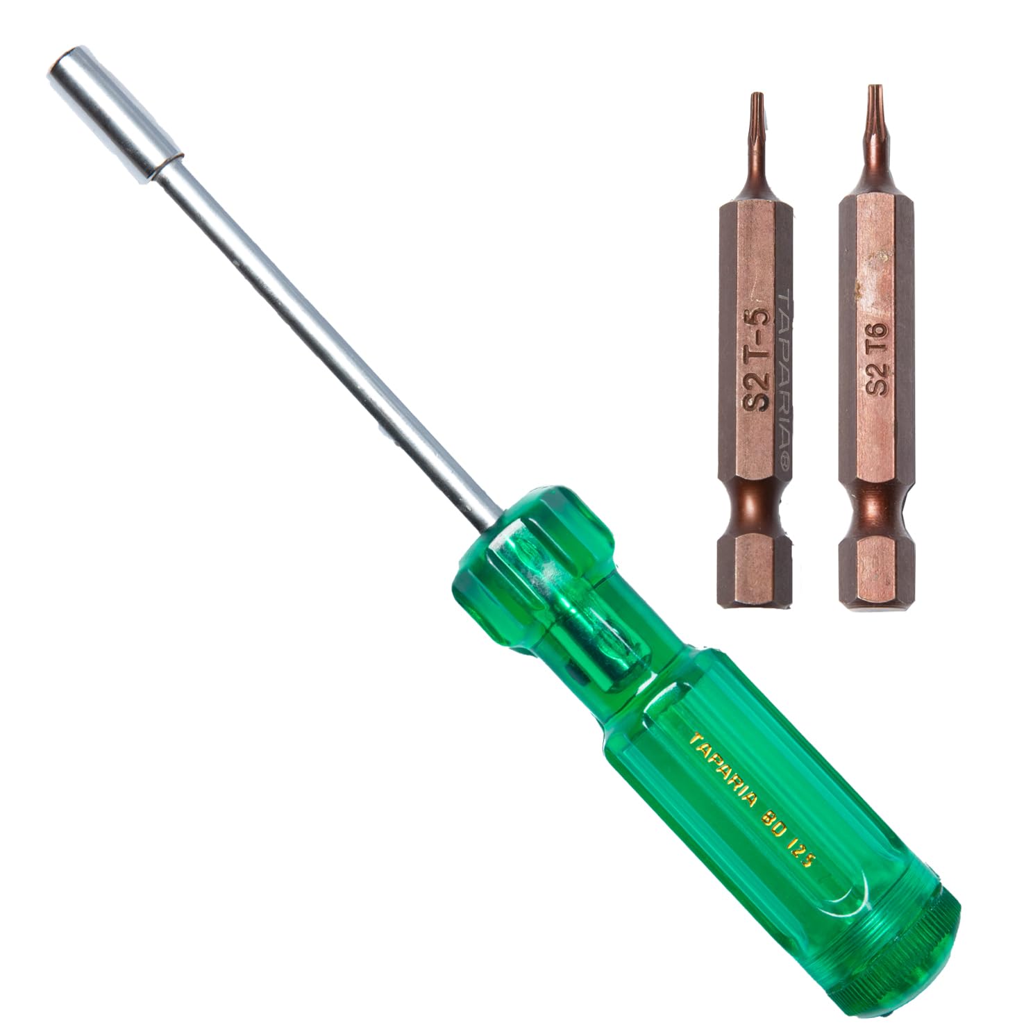 Taparia make 125MM Bit Driver and 50mm Torx head screwdriver bit size T5,T6. Torx bits are used to drive screws with matching Torx heads. They offer high torque transfer, minimize slippage, and reduce fatigue during assembly, making them popular in various industries. Automotive: Used in various automotive applications for assembly and repair and various other applications. BD125 Bit Drivers are primarily used for driving and removing screws of various types, including flathead, Phillips, Torx, and Hex. It is specifically designed for driving or removing screws with various head types. It can be used for a wide range of applications including home repairs, construction, and even in industries like electronics and electrical work.