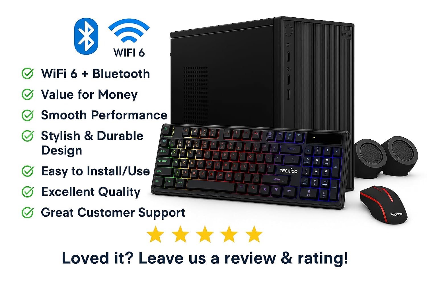 Experience computing excellence with the Tecnico Victory Desktop CPU Set, a complete computing solution designed for both productivity and entertainment. This powerful system features an Core i5 6600 processor paired with 8 GB DDR4 RAM and a swift 128 GB SSD, ensuring smooth multitasking and quick system responsiveness. The package includes a stunning 20-inch LED monitor that delivers crisp visuals for all your computing needs. Enhance your gaming and typing experience with the included RGB keyboard and mouse set, featuring customisable lighting effects. Stay connected with modern WiFi 6 technology and Bluetooth connectivity for seamless wireless peripherals integration. The set comes complete with quality speakers and a comfortable headphone set for immersive audio experience. Whether you’re working, gaming, or creating content, this comprehensive desktop solution provides all the essential components needed for a premium computing setup. The sleek black design adds a professional touch to any workspace while maintaining functionality and performance.