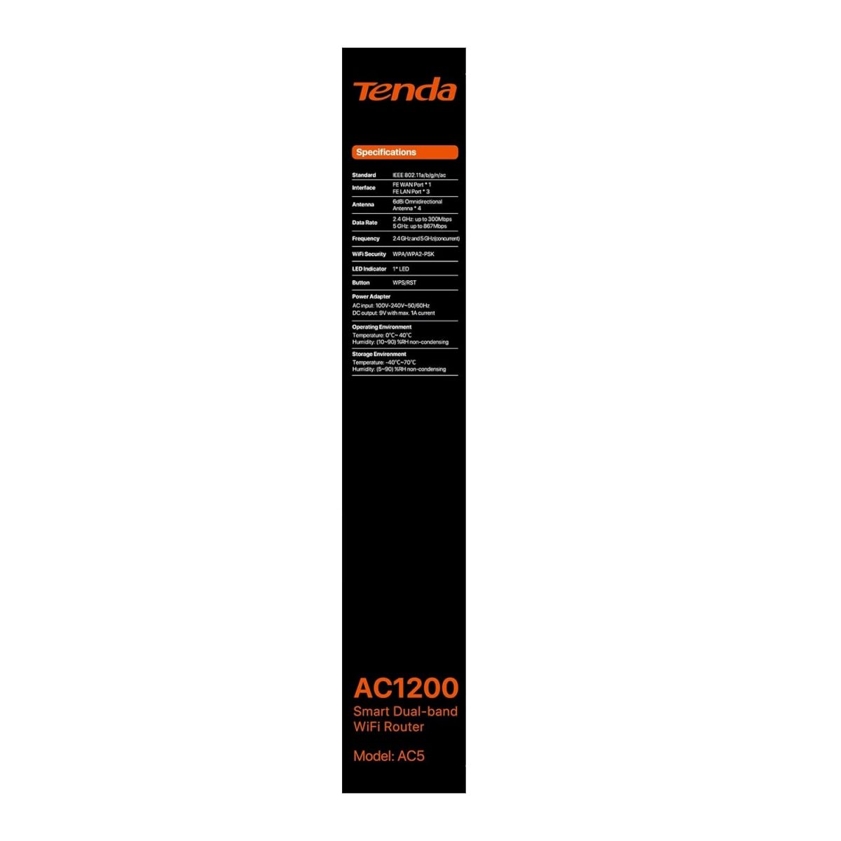 Compliant with 802.11ac Wave 2.0 Standard – powered by new 802.11ac Wave 2.0 technology, AC5 offers a combined dual band wireless transmission as high as of 1167 Mbps With the MU-MIMO technology, AC5 can communicate with multiple devices at a time, over 20 percent faster in internet connection. 1 GHz High Frequency CPU Made with 28 nm process – with the most advanced 28 nm process made by Netcom, AC5 outperforms router made chips with 40 nm process on power saving Powered by 1 GHz high frequency CPU, AC5 offers more reliable and stable internet connection Migration of ISP user name and password – migration of ISP User name and password replacement of router easy without login in to the web UI of router to configure Local and remote management via Tenda WiFi app – with Tenda WiFi app, you can manage your Router anytime anywhere