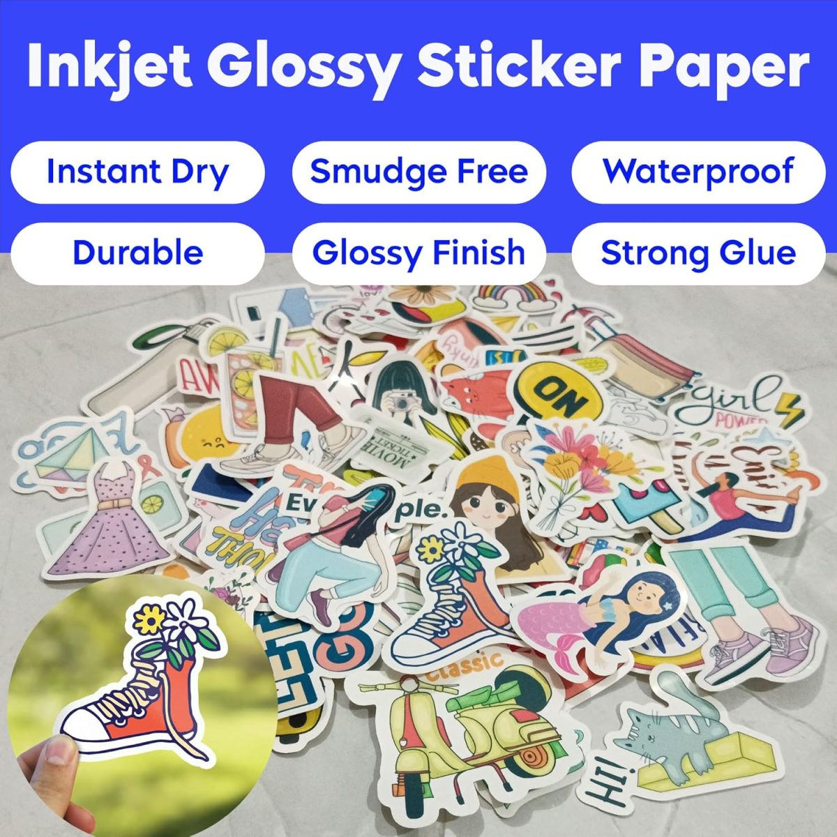 GLOSSY INKJET STICKER SHEET : Ultra smooth surface. Self Adhesive High glossy, ideal for photo stickers and colorful stickers.