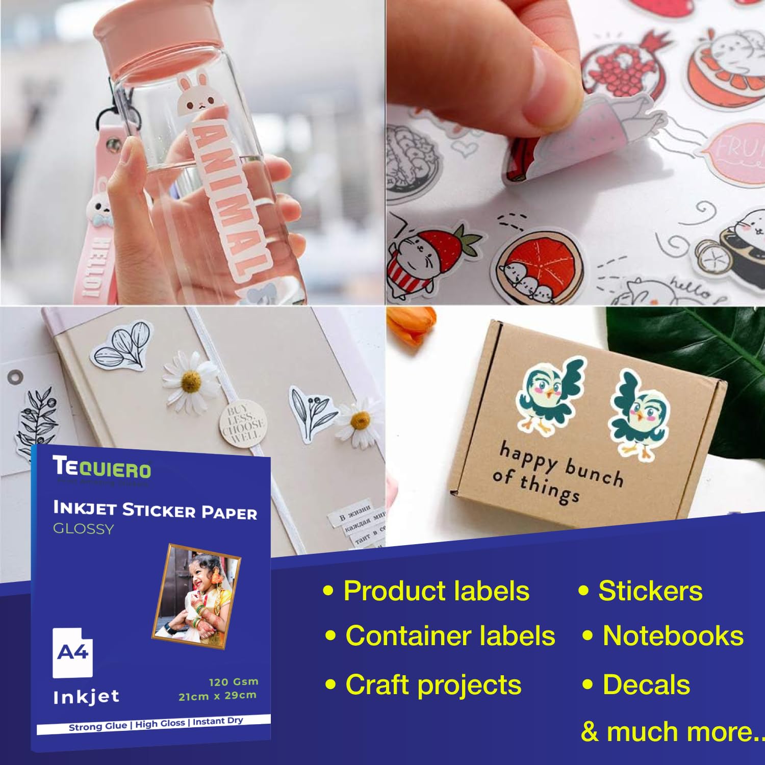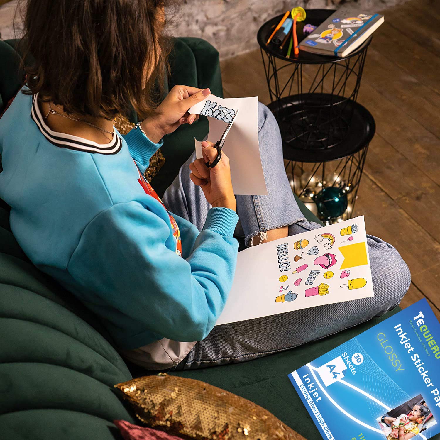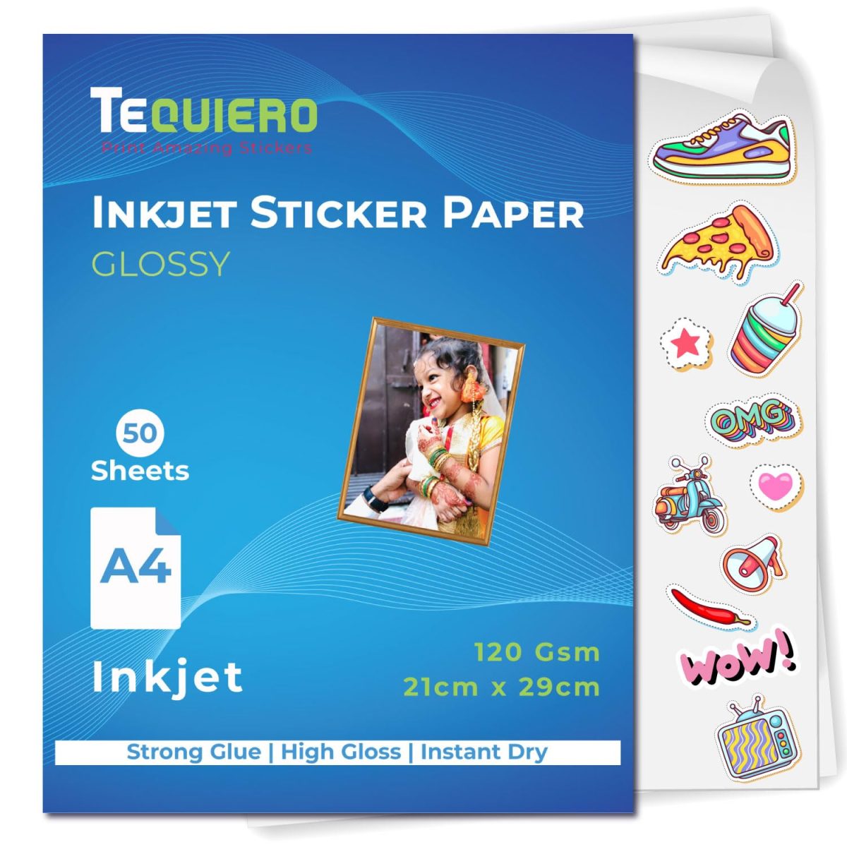 TeQuiero 50 Glossy Inkjet Sticker Photo Paper a4 Size Self Adhesive Photo Sheets for Inkjet Printer 120 GSM – 50 Sheets
