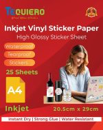 TeQuiero Vinyl Sticker Paper for Inkjet Printer High Glossy, Waterproof, Tear Resistant, Instant Dry, for DIY Stickers Printing Art, Self Adhesive Photo Sheets – 25 Sheets A4 Size