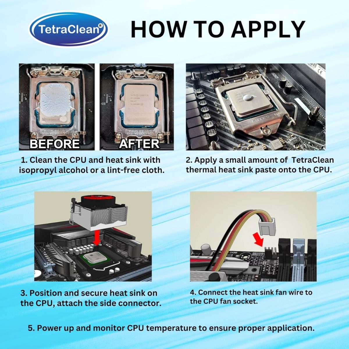 Thermal paste (also called thermal compound, thermal grease, thermal interface material (TIM), thermal gel, heat paste, heat sink compound, heat sink paste, or CPU grease) is a thermally conductive (but usually electrically insulating) chemical compound, which is commonly used as an interface between heat sinks and heat sources such as high-power semiconductor devices. The main role of thermal paste is to eliminate air gaps or spaces (which act as thermal insulation) from the interface area in order to maximize heat transfer and dissipation. Thermal paste is an example of thermal interface material. Tetraclean Heat Sink Paste / Thermal Paste Compound can be used to improve the effectiveness of a CPU cooler, by thermally bonding the surface of the CPU to the heatsink, which enables the heatsink and fan to work more efficiently to remove harmful heat from the CPU. This white color thermal grease is enough for a large number of CPU installations for most home or business computers or any other light application where good thermal bonding between two surfaces is required. Product Features: *High Performance *High temperature – resistance *Low thermal resistance *Non-Electrical Conductive *Non-corrosive *Non-toxic Working principle: Filling the gap between the heating element and the cooling device, Increasing the contact area so as to achieve the soundest thermal conductivity effect. Helps disperse the heat from CPU to heatsink effectively. Wide range application: Suitable for: CPU, GPU, Heatsink, Ovens, Chipset, Xbox, High power LED, and other components. Excellent ease of use and outstanding long-term stability.