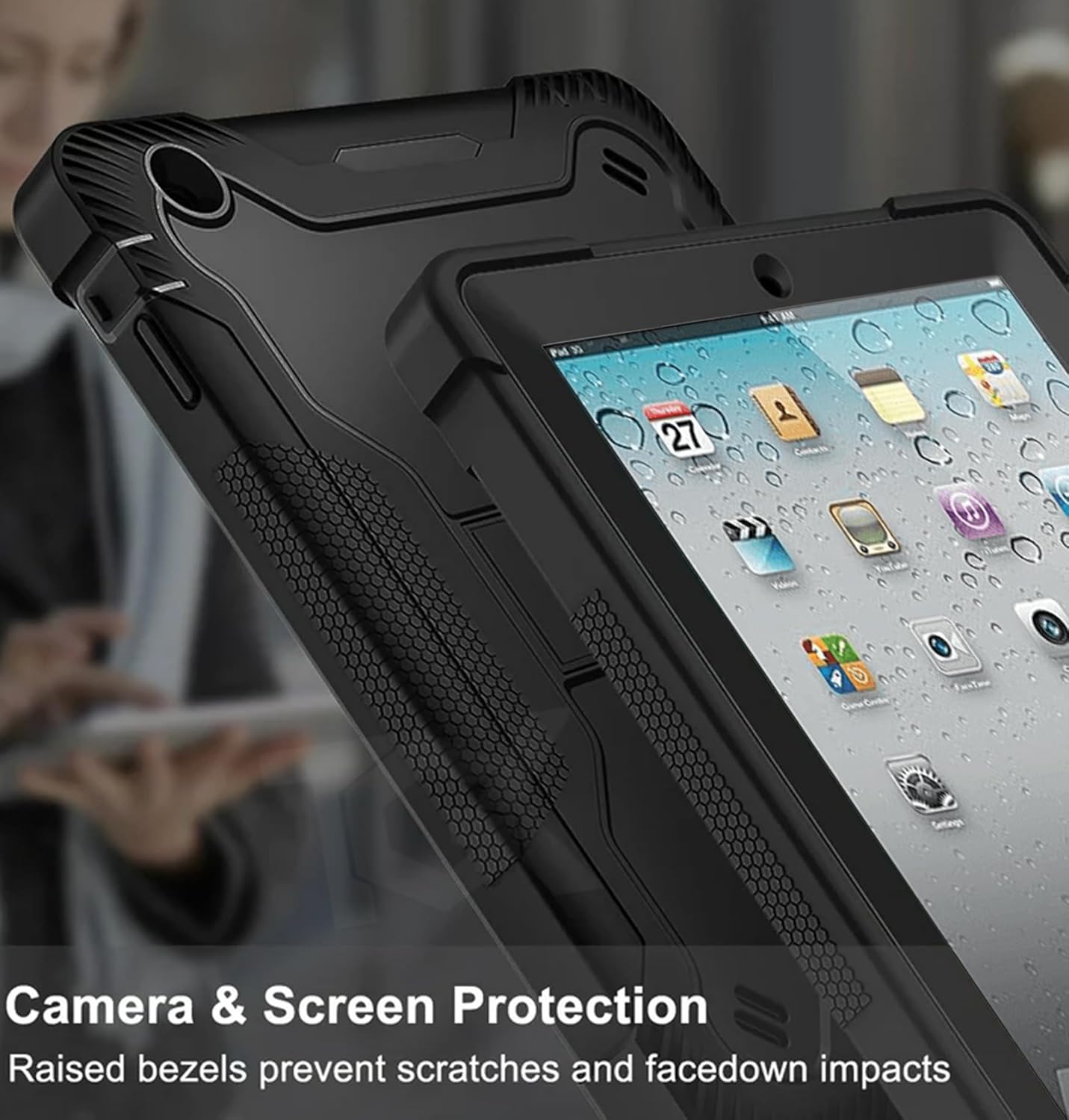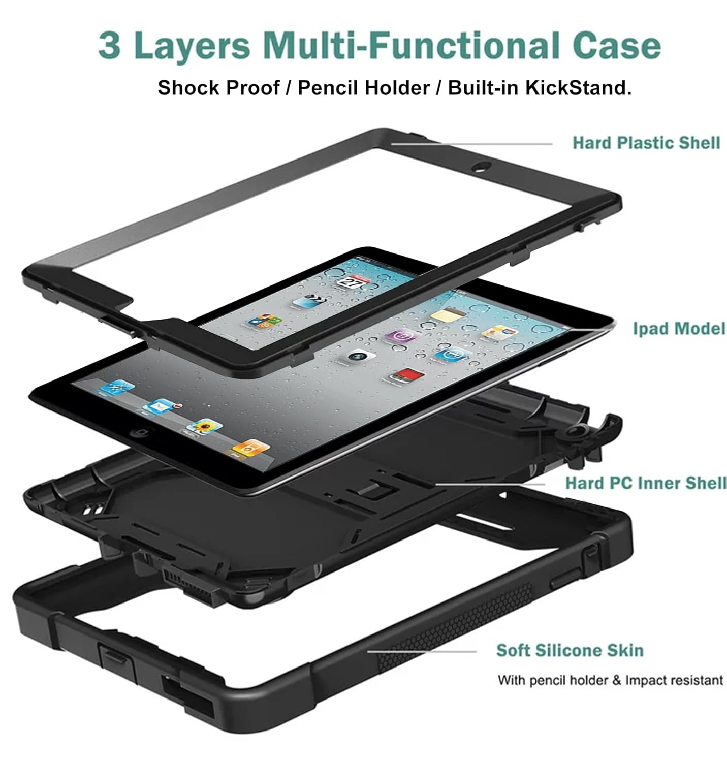 [Protection] : Hard plastic front bumper + Hard plastic inner shell + Flexible rubber back cover, this three layers case for iPad 4th Gen 9.7 inch is durable enough to protect your iPad 4th Gen 9.7 inch from certain scratches and occasional drops. Raised lips comes over the screen and camera stop debris and lens scratching.