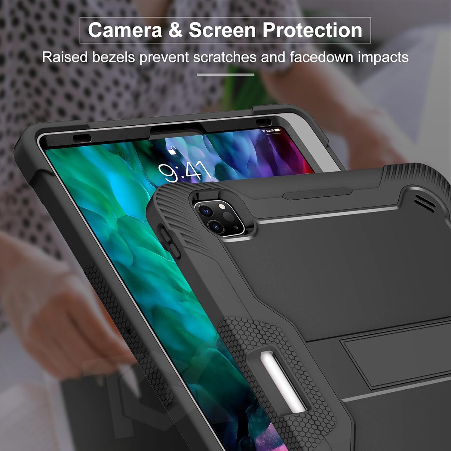 [Protection] : Hard plastic front bumper + Hard plastic inner shell + Flexible rubber back cover, this three layers case for iPad Pro 2020 (4th Generation) 12.9 inch is durable enough to protect your iPad Pro 2020 (4th Generation) 12.9 inch from certain scratches and occasional drops. Raised lips comes over the screen and camera stop debris and lens scratching.