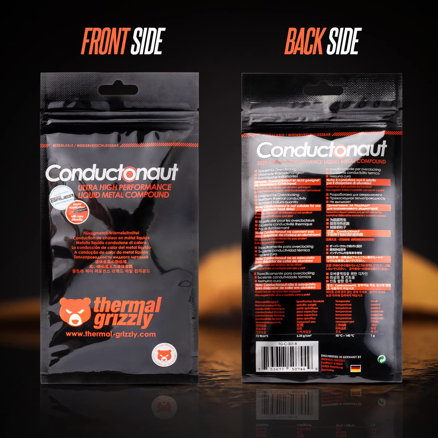 Our Conductonaut liquid metal thermal compound is designed for applications that require very high efficiency. Conductonaut is recommended for experienced users who are looking for a top performance product with best heat dissipation where temperature ranges are above 8 °C. Thermal Grizzly Conductonaut is a liquid metal thermal compound based on a eutectic alloy. Our special mixture of metals like tin, gallium and indium, Conductonaut excels with a very high thermal conductivity. We recommend to apply Conductonaut on nickel plated surfaces since this will provide the best long term stability in performance.