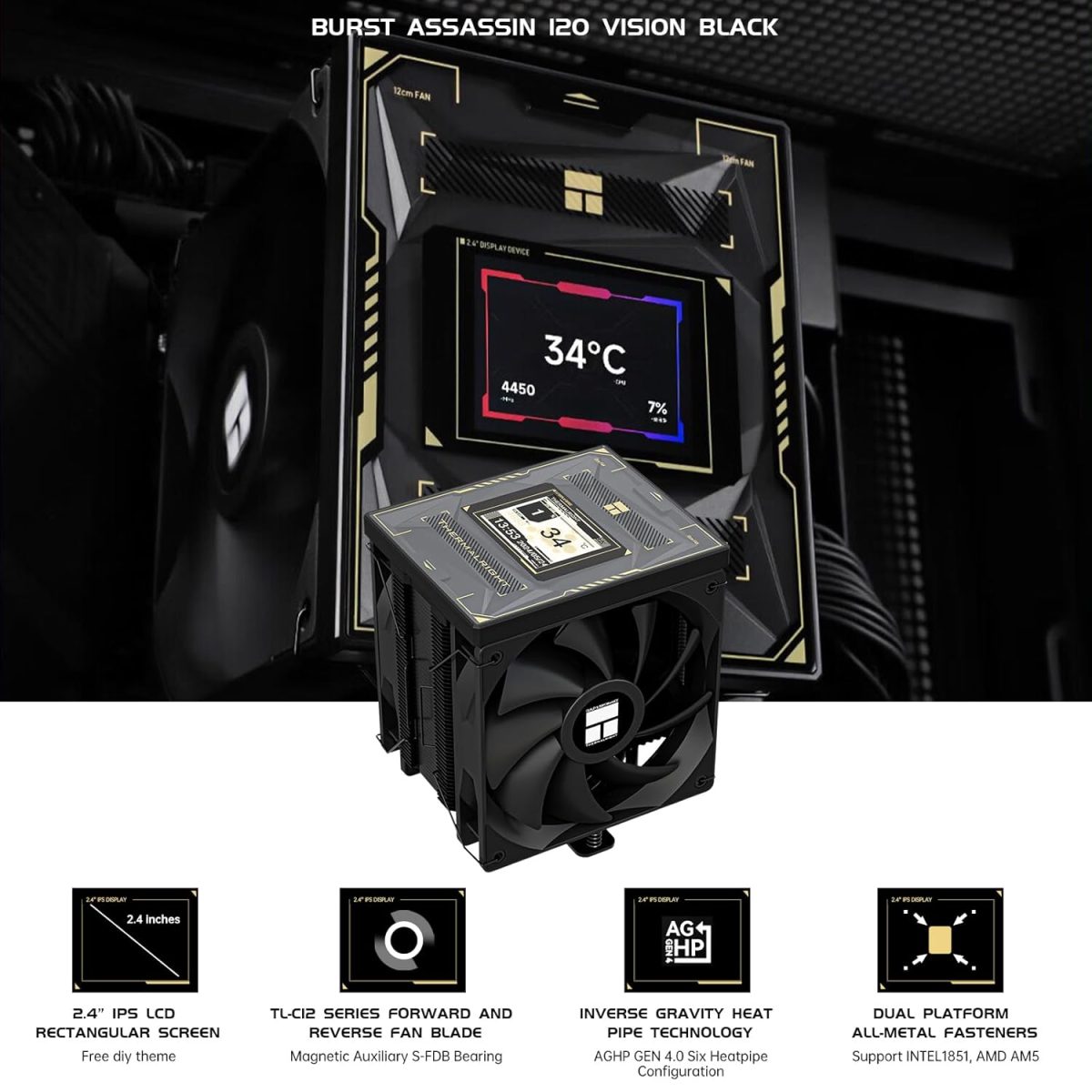 Thermalright Burst Assassin 120 Vision Black CPU Air Cooler – IPS 2.4-inch Square Rotatable Display, 120mm Forward and Reverse Fan Design, Support Intel LGA1700/1150/1151/1200, AMD AM4/AM5