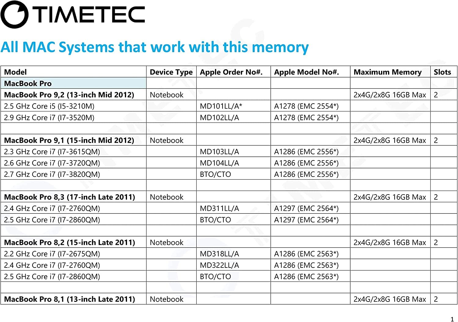 Size:16GB Kit (2x8GB) Timetec – Memory of a lifetimeCompatible with (But not Limited to):*Please click image for more compatible systems modelMacBook Pro 9,2 (13-inch Mid 2012))2.5 GHz Core i5 (I5-3210M)2.9 GHz Core i7 (I7-3520M)MacBook Pro 9,1 (15-inch Mid 2012)2.3 GHz Core i7 (I7-3615QM)2.6 GHz Core i7 (I7-3720QM)2.7 GHz Core i7 (I7-3820QM)iMac 13,1 (21.5-inch Late 2012)2.7 GHz Core i5 (I5-3335S)2.9 GHz Core i5 (I5-3470S)3.1 GHz Core i7 (I7-3770S)iMac 13,3 (21.5-inch Early 2013)3.3 GHz Core i3 (I3-3225)iMac 14,1 (21.5-inch Late 2013)2.7 GHz Core i5 (I5-4570R)iMac 14,3 (21.5-inch Late 2013)2.9 GHz Core i5 (I5-4570S)3.1 GHz Core i7 (I7-4770S)iMac 13,2 (27-inch Late 2012)2.9 GHz Core i5 (I5-3470S)3.2 GHz Core i5 (I5-3470)3.4 GHz Core i7 (I7-3770)iMac 14,2 (27-inch Late 2013)3.2 GHz Core i5 (I5-4570)3.4 GHz Core i5 (I5-4670)3.5 GHz Core i7 (I7-4771)iMac 15,1 w/Retina 5K display (27-inch Late 2014)3.5 GHz Core i5 (I5-4690)4.0 GHz Core i7 (I7-4790K)iMac 15,1 w/Retina 5K display (27-inch Mid 2015)3.3 GHz Core i5 (I5-4590)Mac mini 6,1 (Late 2012)2.5 GHz Core i5 (I5-3210M)Mac mini 6,2 (Late 2012)2.3 GHz Core i7 (I7-3615QM)2.6 GHz Core i7 (I7-3720QM)Mac mini 6,2 (Late 2012 Server)2.3 GHz Core i7 (I7-3615QM)2.6 GHz Core i7 (I7-3720QM)Need to know if this part is compatible?Contact us with manufacturer and model information of your motherboard