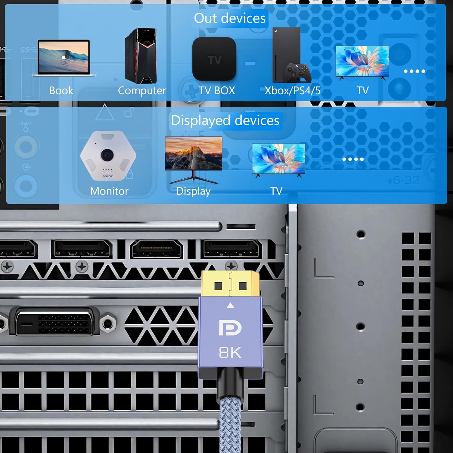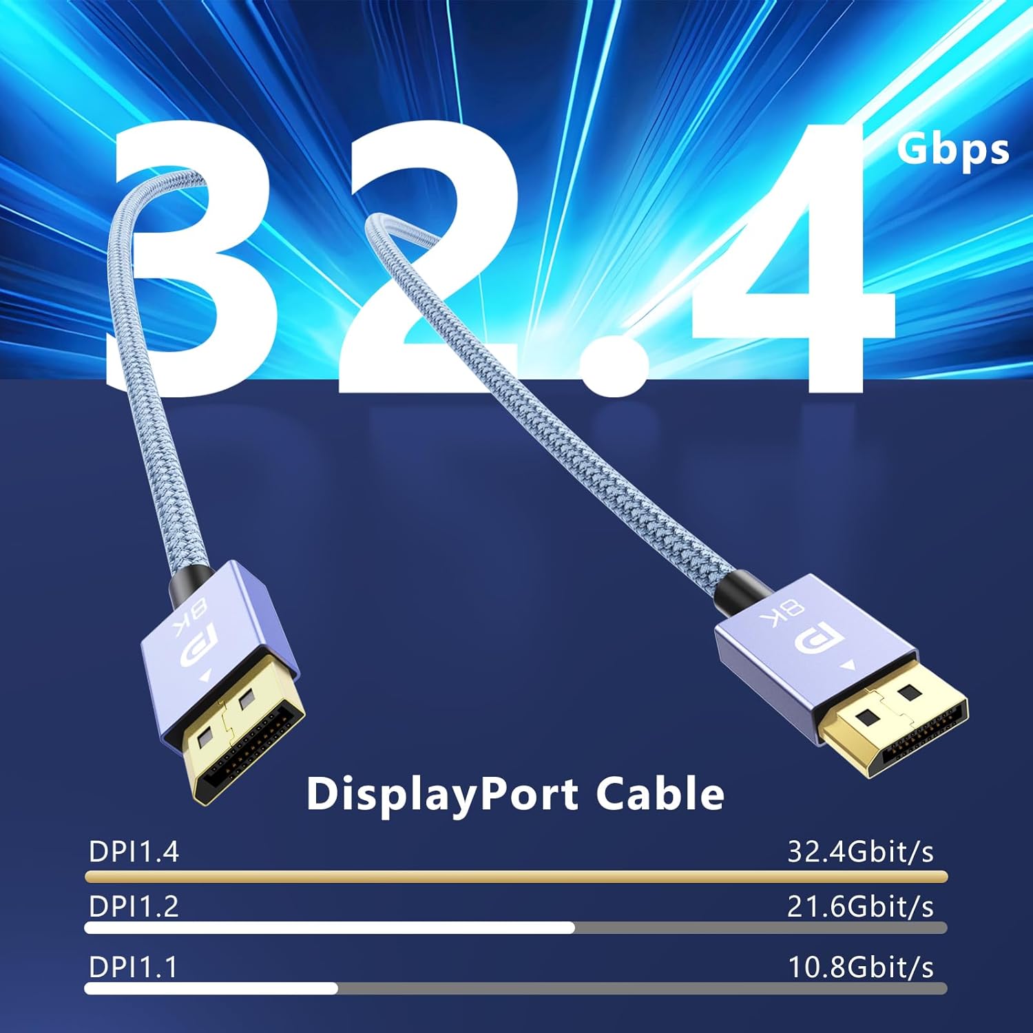 【8K DisplayPort Cable 1.4】This 8K DP Cable supports high resolutions 8K(7680×4320)@60Hz, 5K@60Hz, 4K@144Hz, 2K@240Hz, 1080P@240Hz and Dynamic HDR and HDCP 2.2; Backwards compatible with DisplayPort 1.3/1.2/1.1, etc; It also works fully with FreeSync and G-Sync; NOT compatible with HDMI / Mini DP.