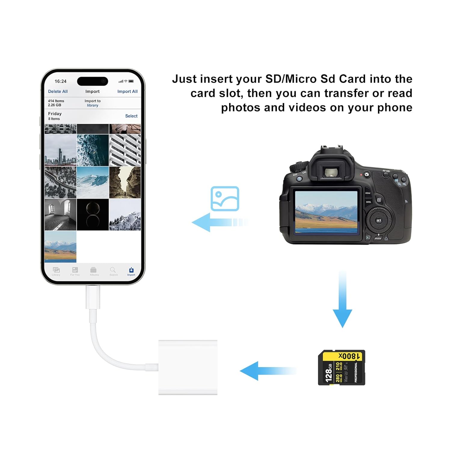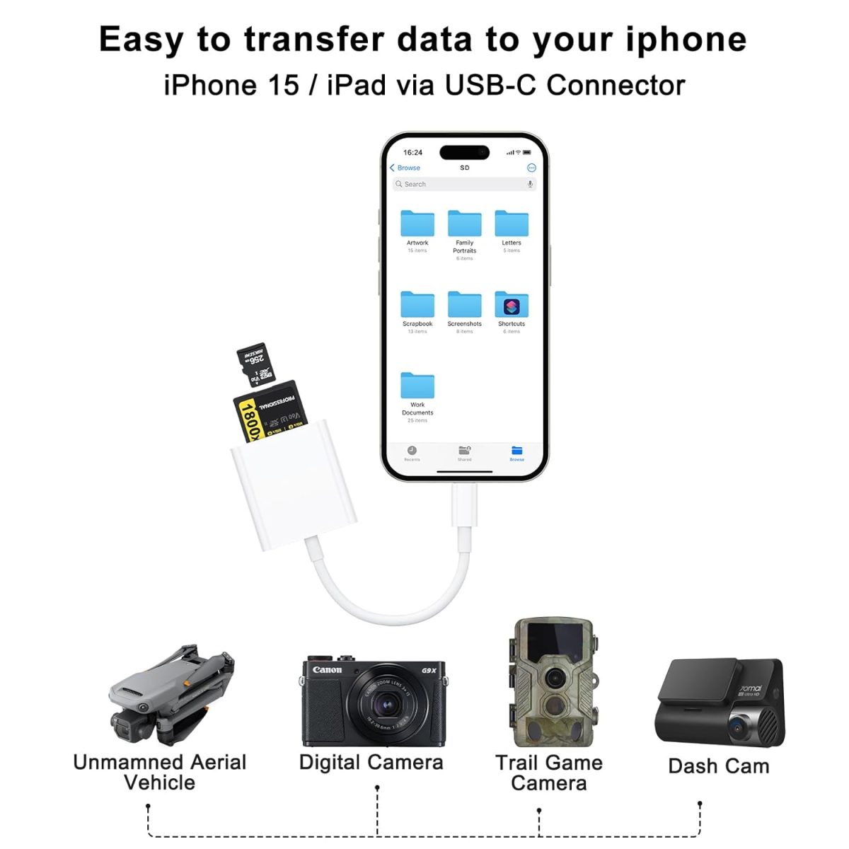 【Fast Speed】The high-speed transfer from the SD card reader can save you a lot of waiting time, allowing you to easily manage data between your iPhone 16/iPad/ Android / Laptop and other devices. Transfer Speed Up to: USB 2.0/480Mbps. Regular speed: 20MB/S~30MB/S.