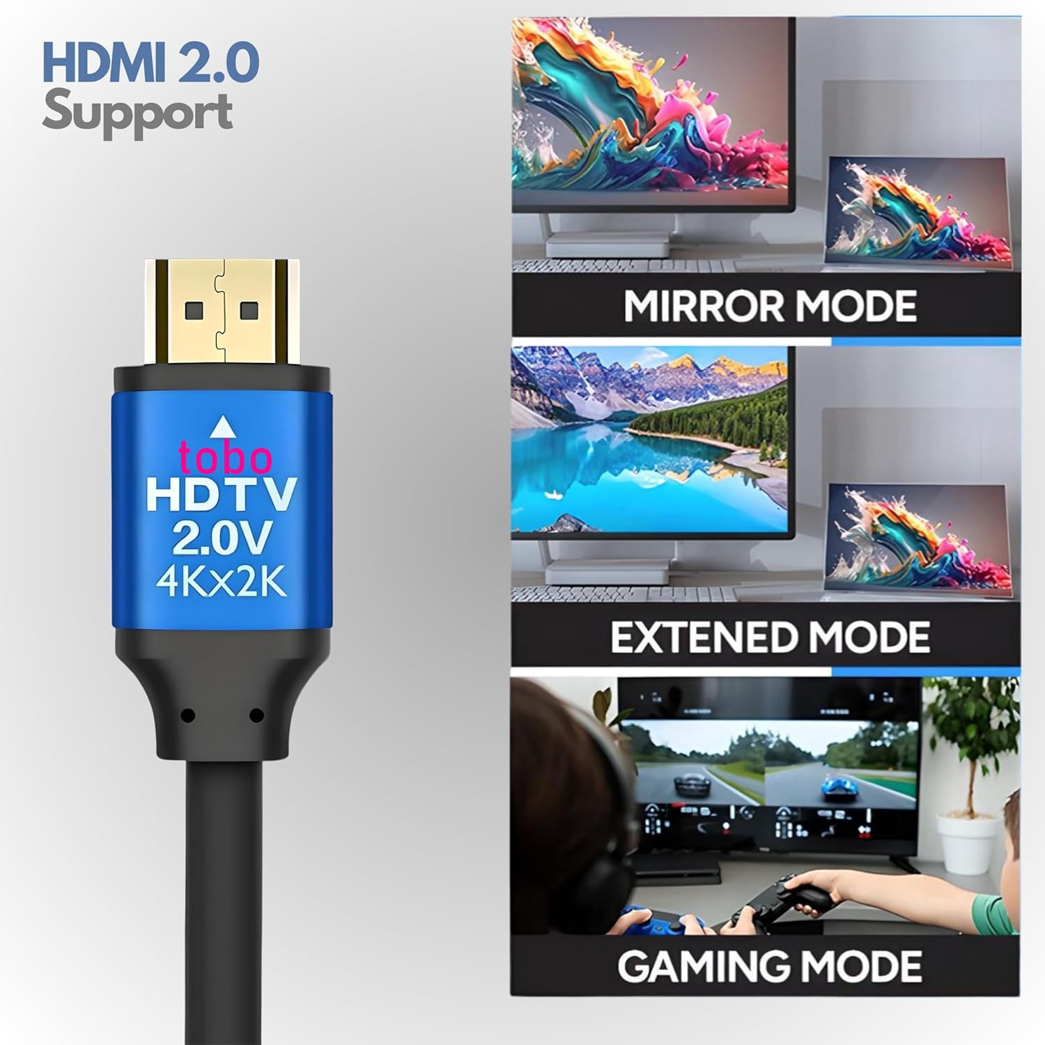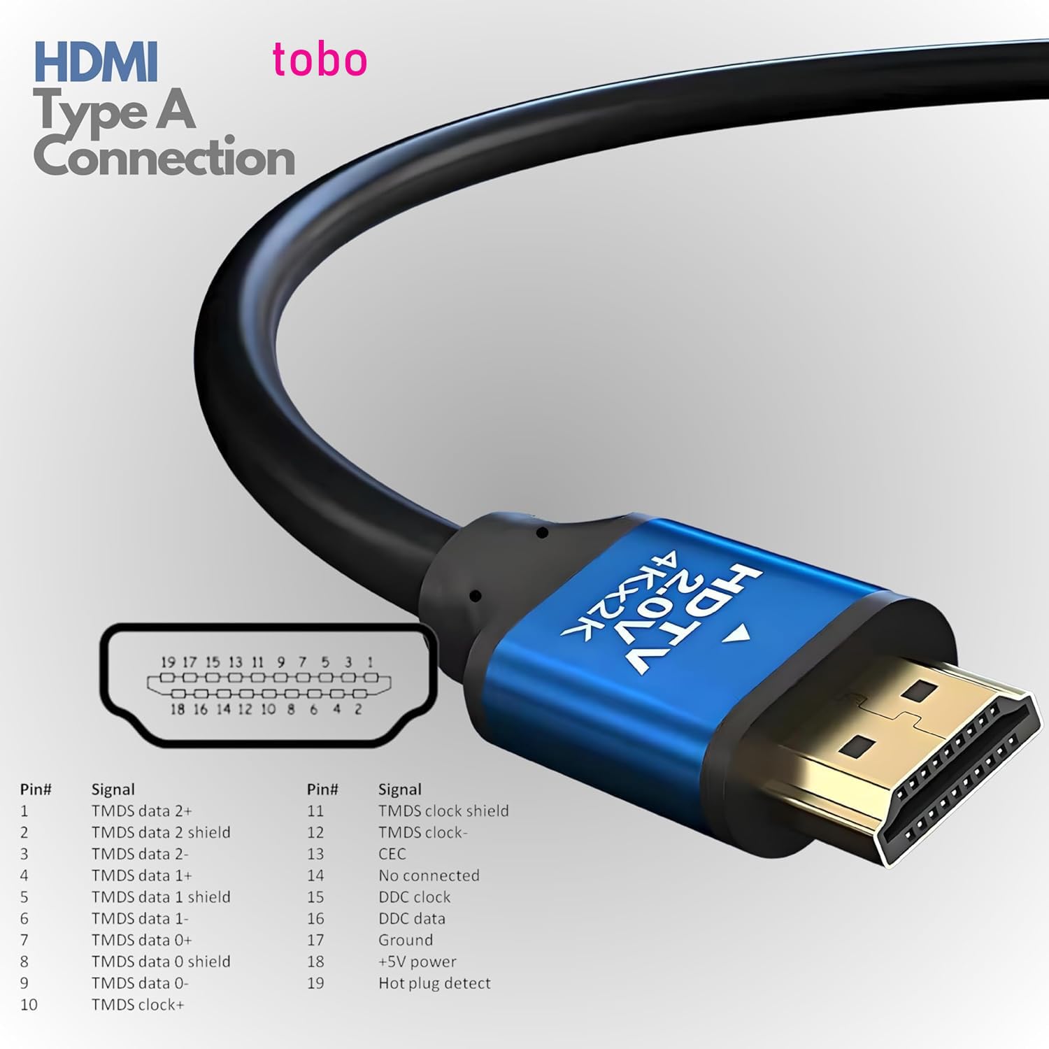The HDMI 2.0 cable features a 19-pin connector configuration designed for transmitting high-definition audio and video signals.