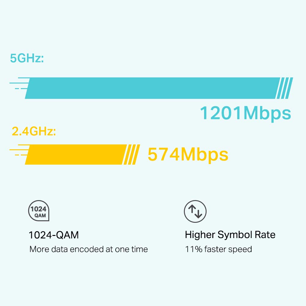 Faster Connections —— Wi-Fi 6 speeds up to 1,800 Mbps—1,201Mbps on 5GHz and 574Mbps on 2.4GHz.;Connect More Devices —— OFDMA and MU-MIMO technology quadruple capacity to enable simultaneous transmission to more devices.