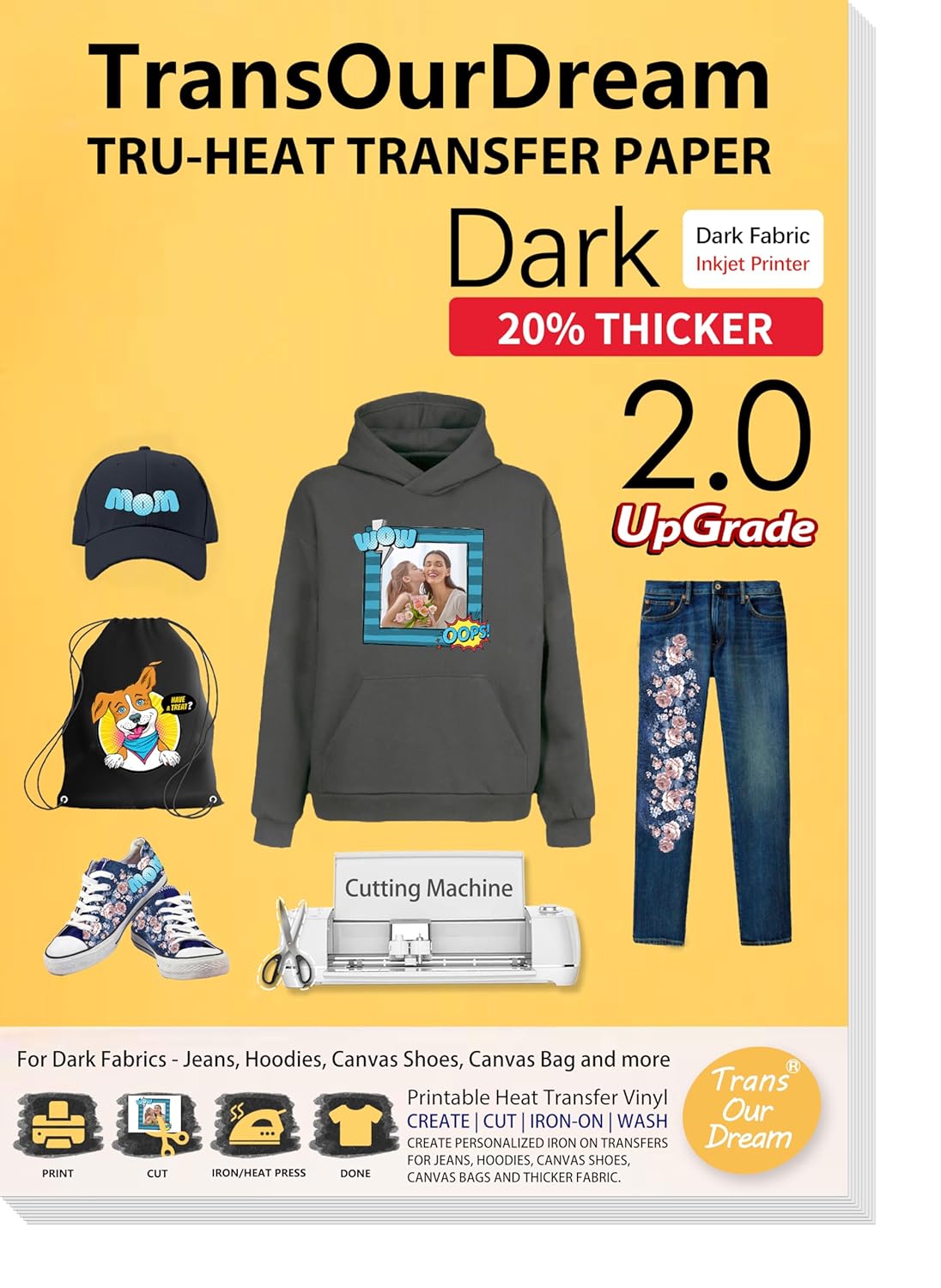 BEST FOR THICK FABRICS: The Upgraded Dark Transfer Paper is best for thick fabrics – like Jeans, Hoodies, Canvas, Thick Cotton and more. Show your creativity in more materials with this printable iron on vinyl.Pack of 5 sheets Dark 2.0 transfer paper and 1 sheets reusable Teflon Paper.