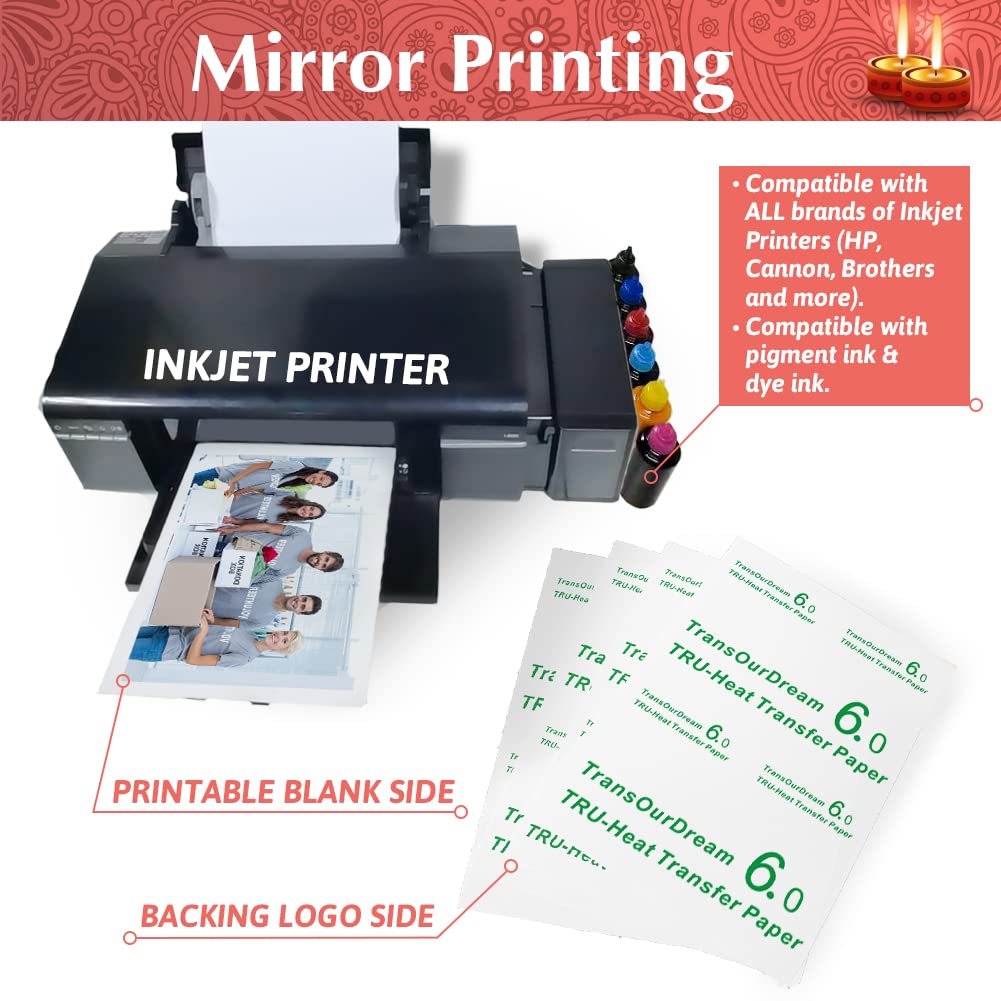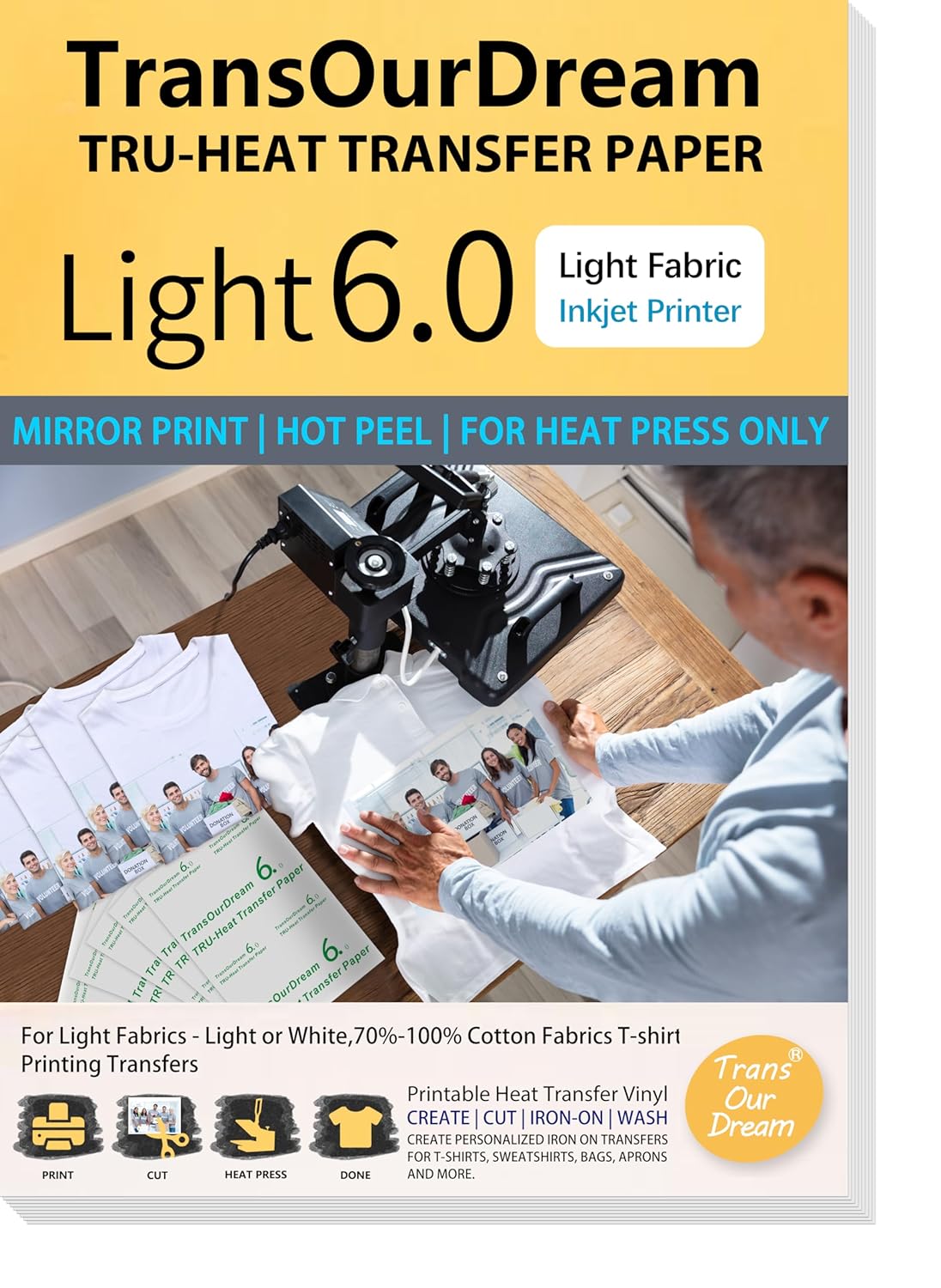 TransOurDream Light 6.0 – Iron on Heat Transfer Paper for Heat Press (5 Sheets, A4) Iron-on Transfers for Light T-Shirts Fabrics Printable Heat Transfer Vinyl for Inkjet Printer(TOD-L6-5)