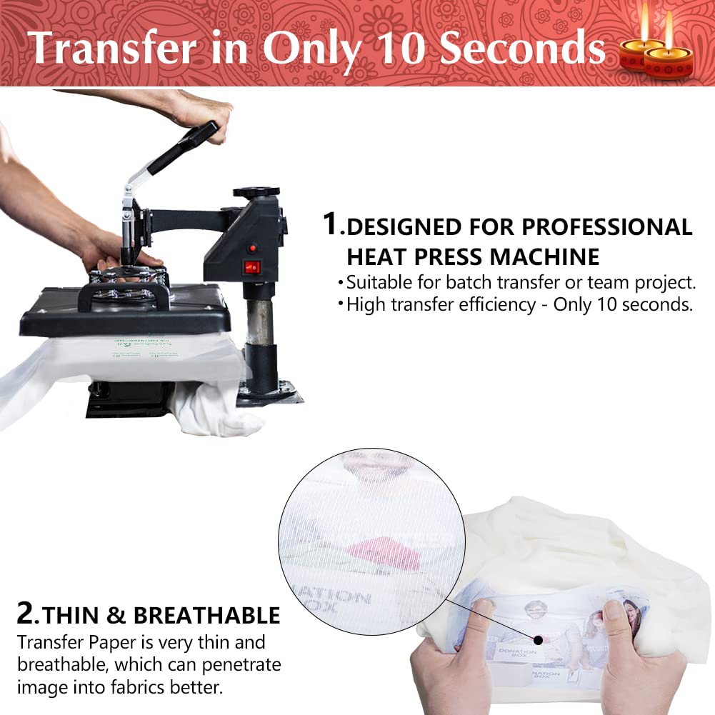 💕PROFESSIONAL TRANSFER PAPER FOR HEAT PRESS ONLY: Specially designed for batch transfer & business project. Get transfer done only in 10 seconds with professional heat press machine. very bright and vivid after transfer. Machine washable and no peeling, no cracking after 30 washes. Start your project with Light 6.0 Transfer Paper! Pack of 5 sheets Light 6.0 transfer paper.
