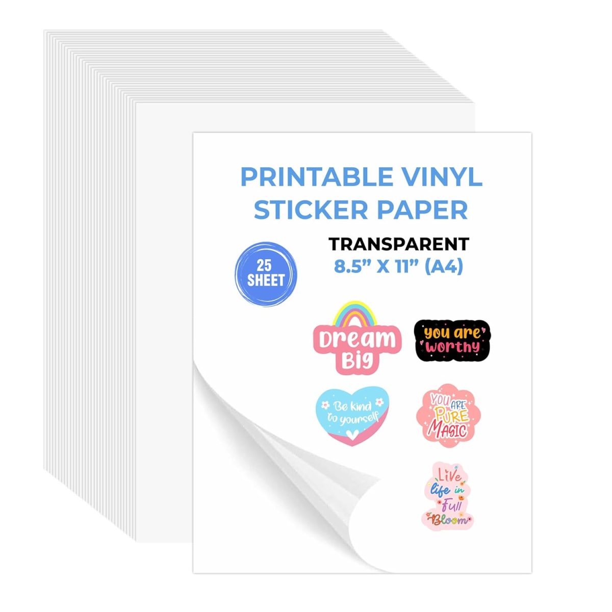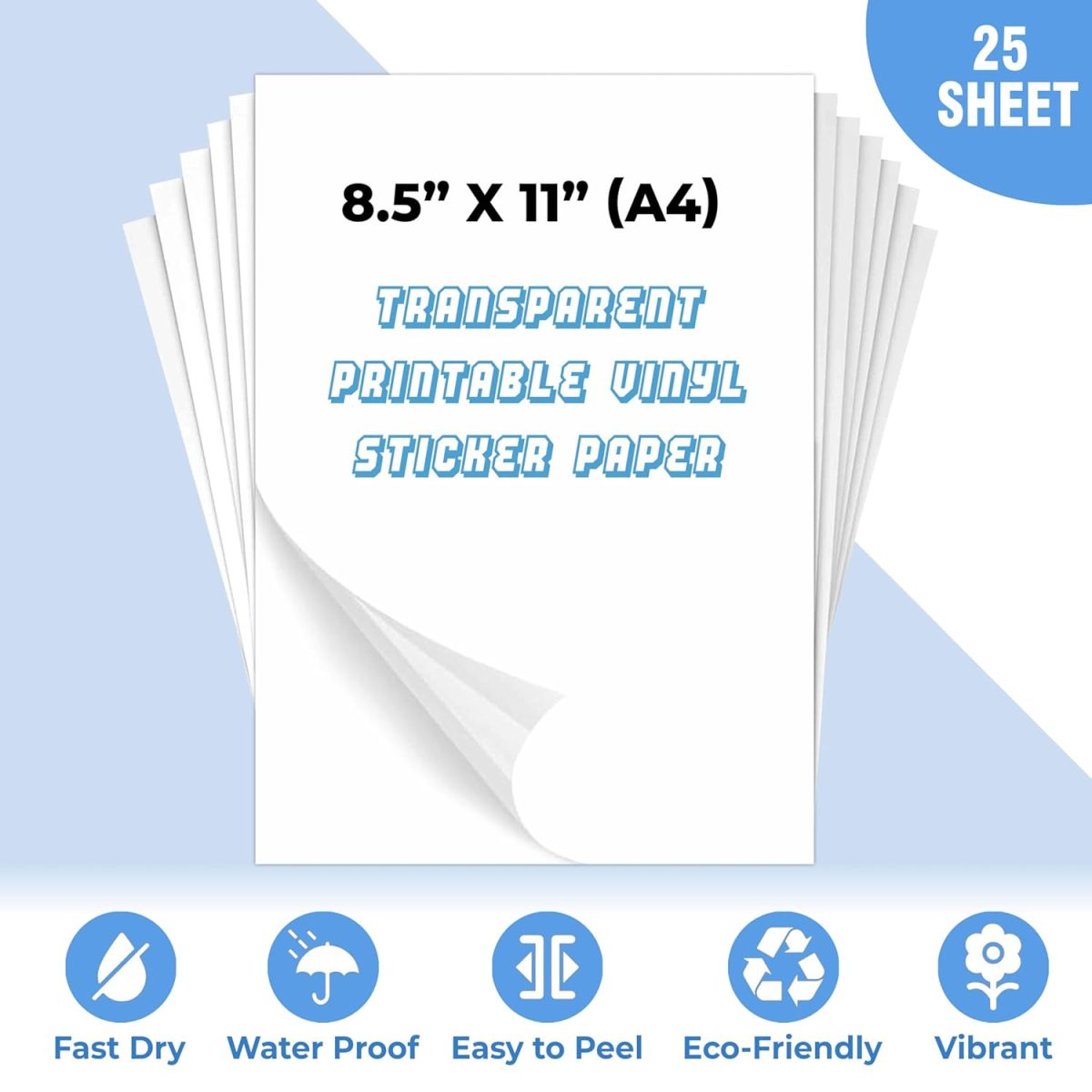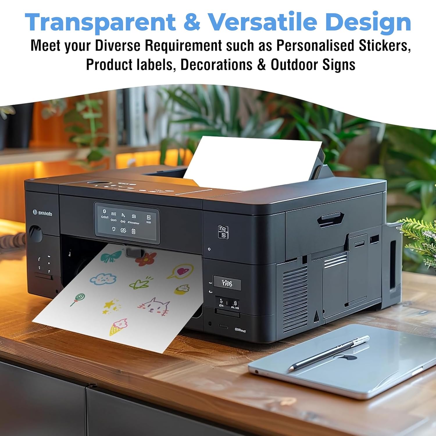 Pack Size: Includes 25 sheets of A4 size (21 cm x 29.7 cm) transparent vinyl sticker paper.