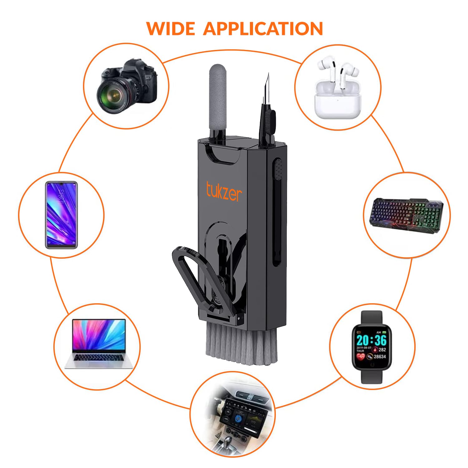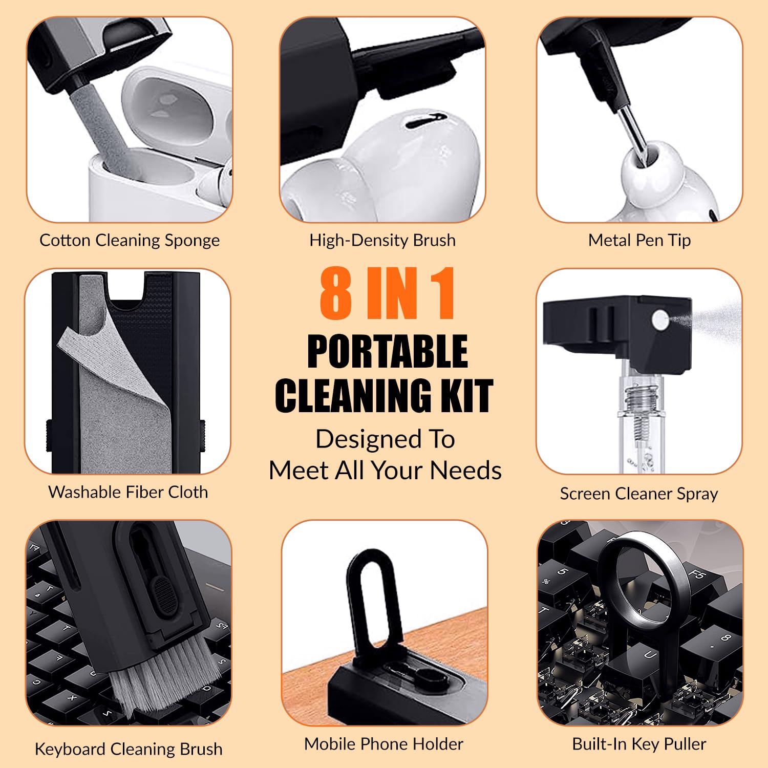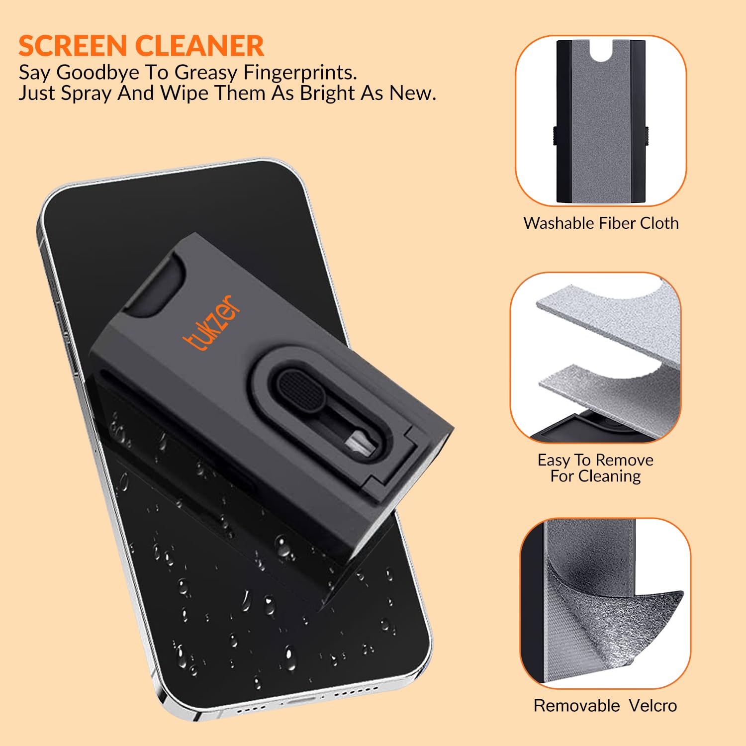 Tukzer Multifunctional 8-in-1 Cleaning Kit with 3-in-1 Cleaning Pen, Screen Cleaner Spray, Cleaning Brush for Keyboard, Mobile Holder| for Gadgets, Earbuds, Mobile, Tablet, Laptop, Computer (Black)