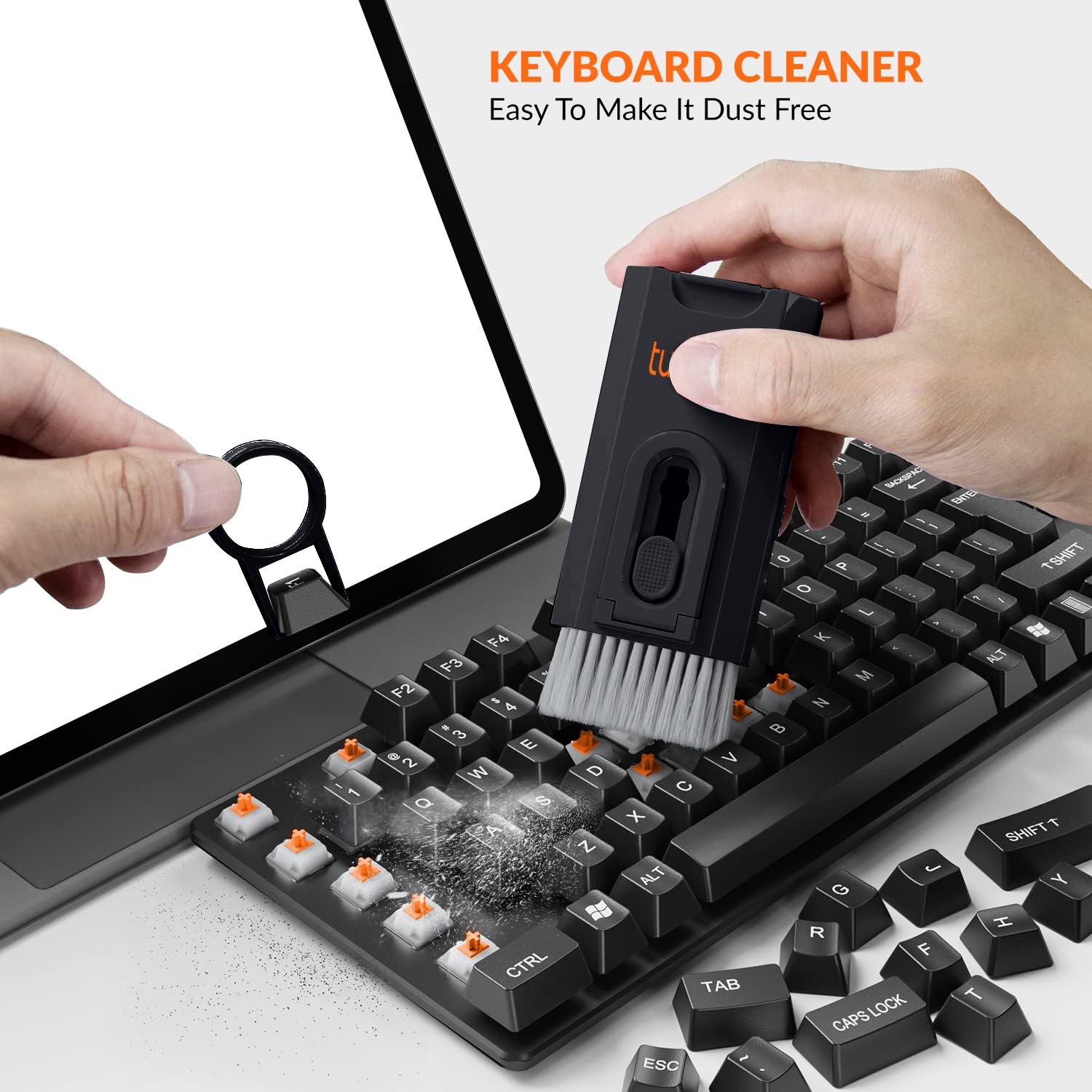 Multipurpose : The multifunctional cleaning pen with mini brush & metal pen tip with flocking sponge can clean the stubborn dust of earphones easily. The cleaning spray with fibre fleece cloth can clean any screen stains and fingerprints instantly. The key puller pulls up the key of the mechanical keyboard and high-density soft brush to clean the dust off.