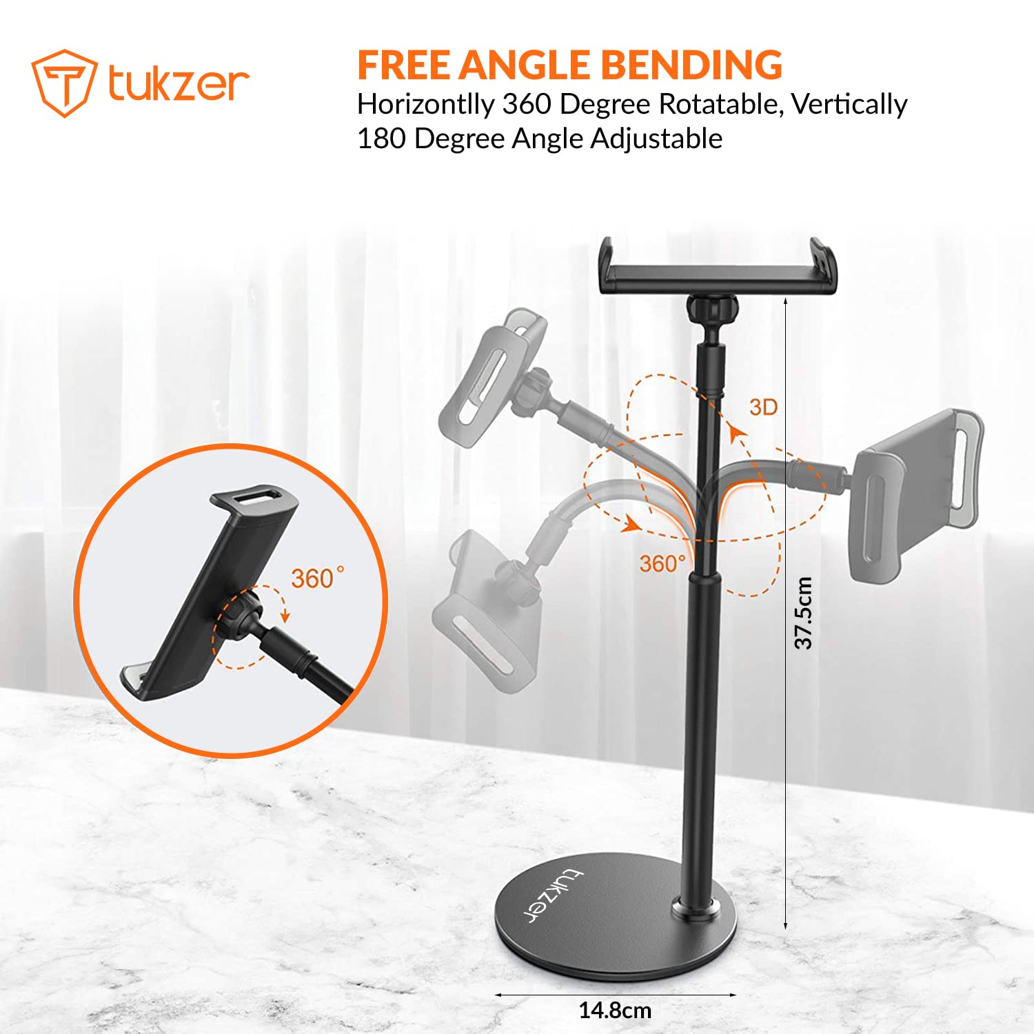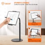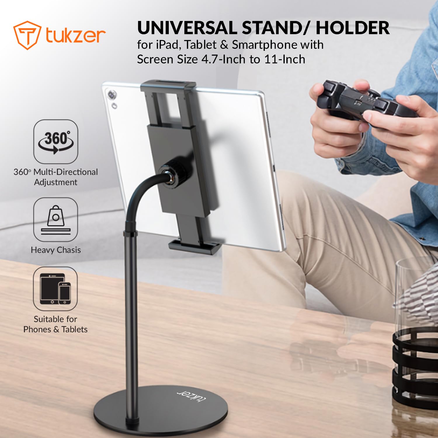 Tukzer Professional Desktop Tablet Stand Mobile Holder with Flexible Arm, 360° Swivel & Height Adjustament| Anti-Skid Sturdy & Heavy Metal Base for 4.7 to 11-Inch Tablet, iPad & Smartphone (Black)
