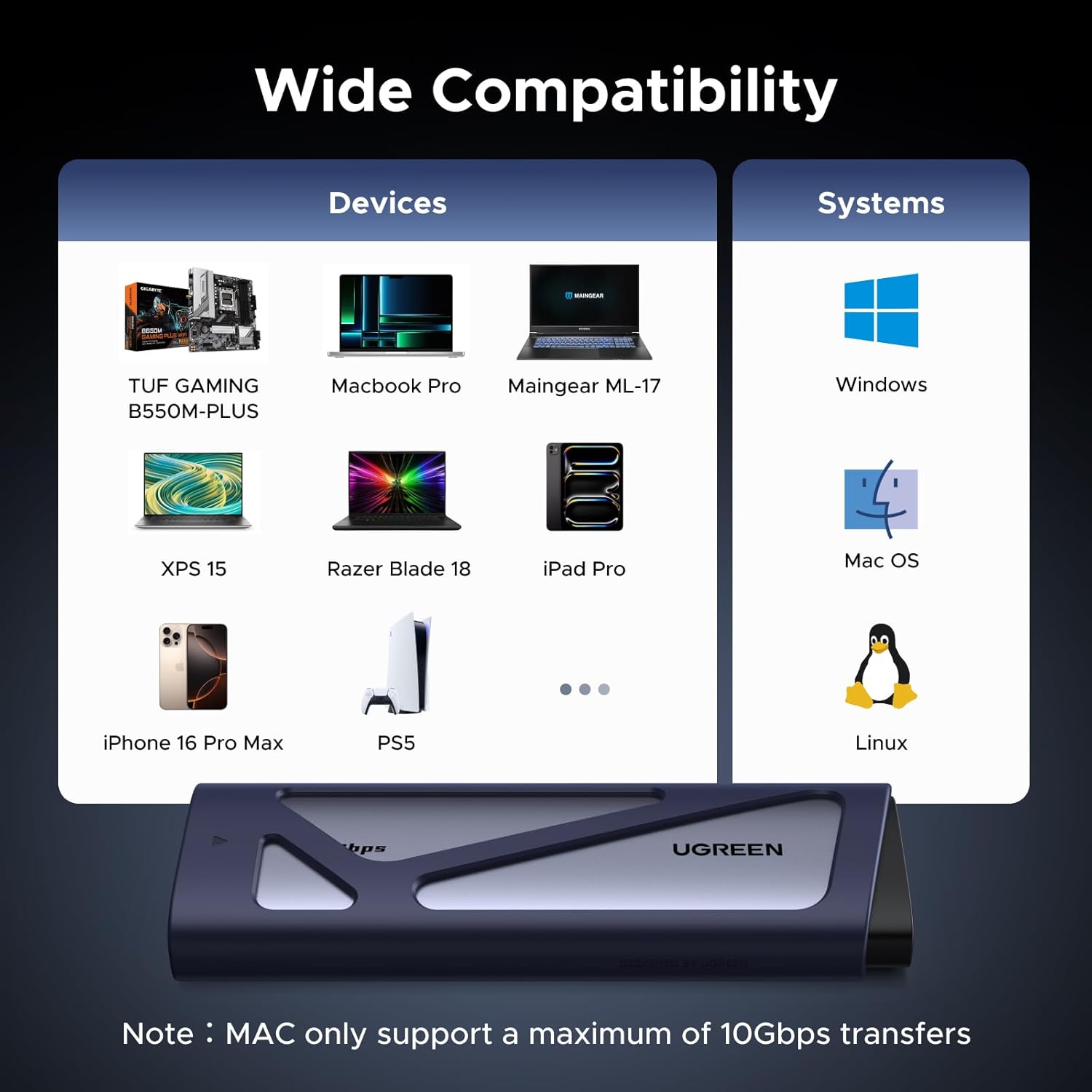 【Secure & Stable Connection】: Featuring UASP and TRIM support, plus an advanced RTL9220 chip with short-circuit and over-current protection, this enclosure ensures safe, stable data transfer. The aluminum case adds extra protection from accidental drops.