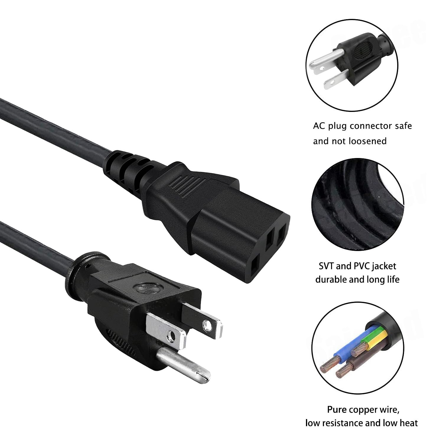 C13 3 Prong 125V 10A 18AWG (approx. 0.81mm) power cords, iec power cord connects from equipment plug to standard 3-prong AC outlet receptacle.