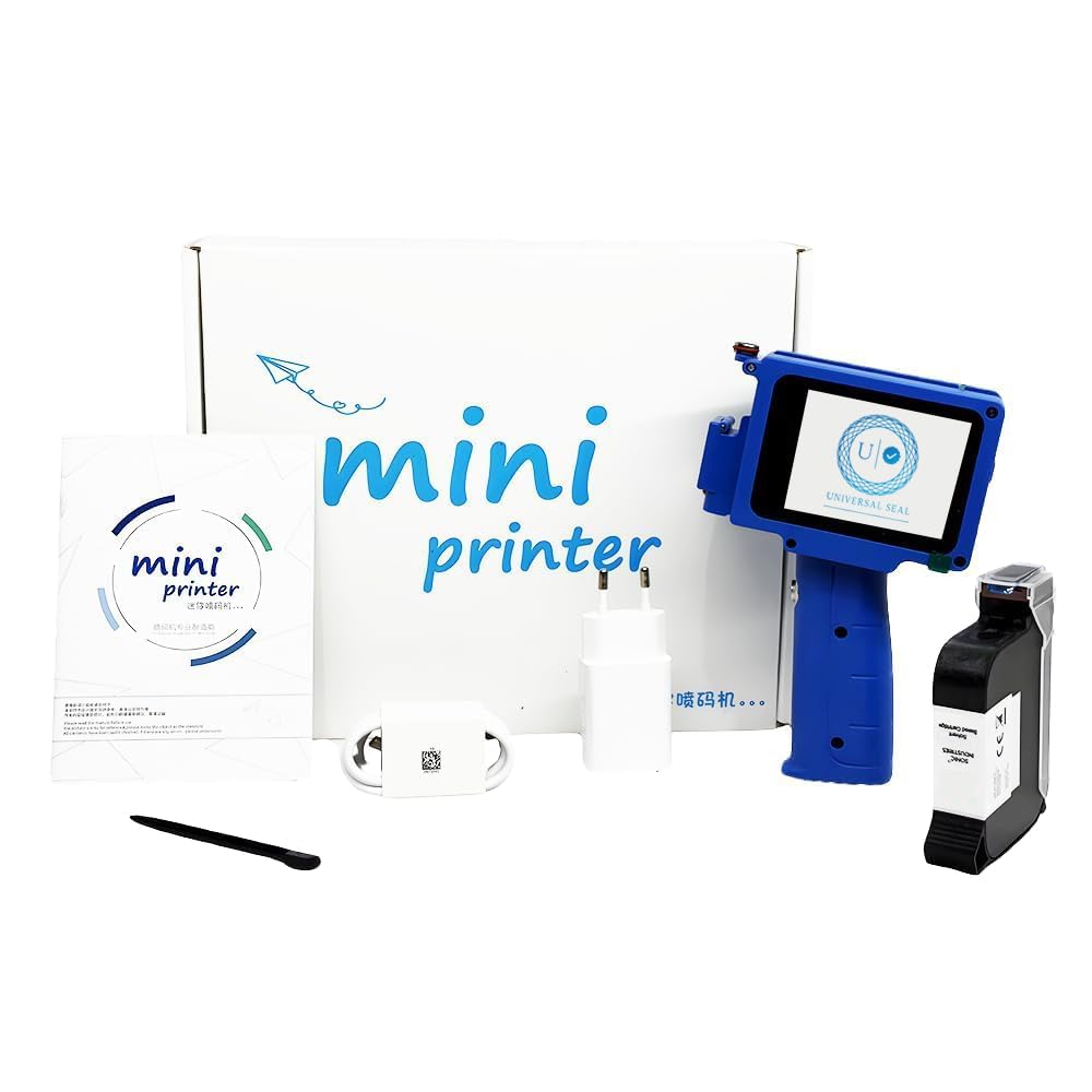 Universal Seal Mini Handheld Inkjet Printer | Touch Screen Date, Batch & Barcode Coding Machine with Black Solvent Ink Cartridge
