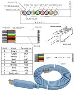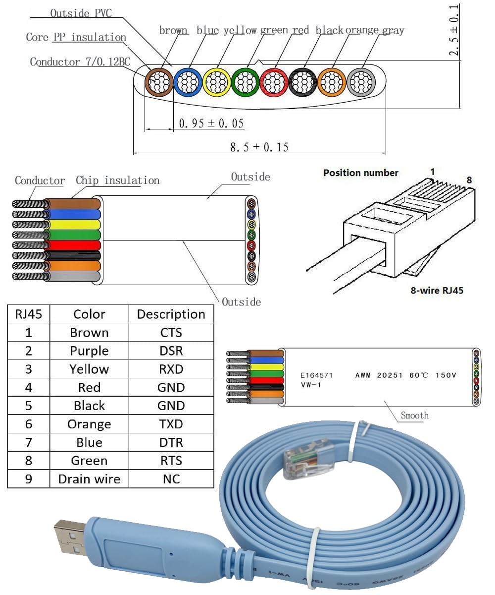 USB2.0 (1.1 compatible); CONSOLE’s DTE Pinouts: RTS(1), DTR(2), TXD (3), GND(4), GND(5), RXD (6), DSR(7), CTS(8); so Moyina RJ45 cable is 1-CTS, 2-DSR, 3-RXD, 4-GND, 5-GND, 6-TXD, 7-DTR, 8-RTS. Cable length 1.8m/6ft, Maximum RS232 speed 500kbaud