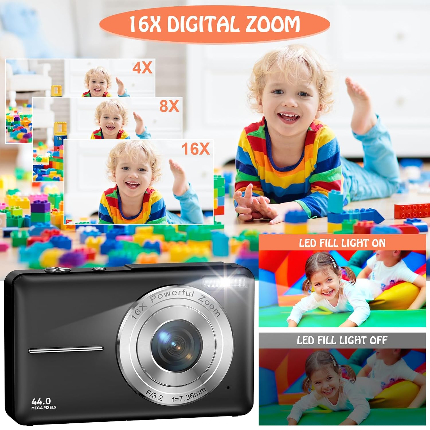 【Fill Light & 16x Digital Zoom】This digital kids camera with built-in flash allows you to take high quality photos in the dark. This Digital Camera supports 16x digital zoom and allows you to zoom in or out of pictures and videos by adjusting the W/T button.