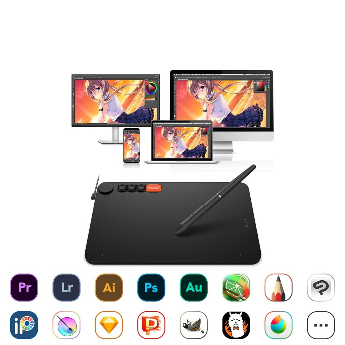 🎨【Ultra Fluid Mechanical Typing】 – The Voila L drawing tablet features 4 customized matte shortcut keys that provide a familiar and comfortable typing experience, similar to a keyboard. These keys offer ultra-precise typing, allowing for seamless creation. 🎨【Replaceable, Cool New Shortcuts】 – Voila L’s colorful replaceable keycaps make it easy to set up common functions like Ctrl+Z and more. Express your personality with the Lively Orange and Classic Black keycaps. The tablet also features a Dial for rapid adjustments to brush size, hardness, flow, opacity, zooming, and image dragging. 🎨【Unleash Your Hand】 – The Voila L graphic tablet provides an ergonomic design with an expanded 10 x 6 inch active area. This improves hand and wrist posture, reducing joint and wrist problems while relieving elbow and shoulder stress. The matte surface offers a comfortable and relaxing drawing experience at home, office, or cybercafes. 🎨【Natural and Precise】 – The P05 stylus of the Voila L tablet offers 8192 levels of pressure sensitivity, allowing for precise line control according to the pressure applied. Lighter pressure produces sharper lines, while harder pressure creates thicker lines. This makes it perfect for artistry design and unique brush effects for photo retouching. With a 290 PPS and 60° tilt, it delivers smoother and more natural lines. 🎨【Multi-OS and Multi-software Support】- VEIKK Voila L digital art tablet is compatible with Windows 7 (or later), Mac OS 10.12 (or later), Android 6-13 and Linux, offering multi-OS and multi-software support. Its compact and lightweight design making it ideal for travel and business trips. It is also compatible with most software, including Adobe Creative software, ibis Paint X, FlipaClip, Medibang, Autodesk Sketchbook, Zbrush, Artrage, and more.
