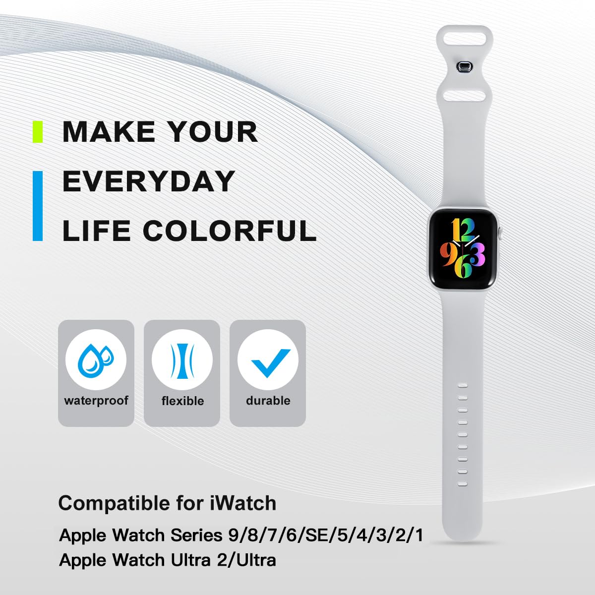 Material: Made of High-Quality flexible and durable soft silicone. Waterproof, lightweight and comfortable to wear.Stylish Buckle Design: Double silicone loop and peg closure, which is sturdy also skin-friendly. The same color clasp as the strap.Precise & Premium Connectors: Easy to install and keep your watch securely in place. You can switch the bands and it only takes seconds.Various Colors: Black, White, Navy Blue, Gray, Midnight Blue, Pink Sand, Wine Red, Light Pink, Rose, Pine Green, Teal and etc.Two Sizes: 38/40/41/42mm(Series 10) Size fits for 5.9″-7.9″ (150mm-200mm) wrist; 44/45/46/49/42mm(Series 3 2 1) Size fits for 6.3″ – 8.3″ (160mm-210mm) wrist.