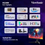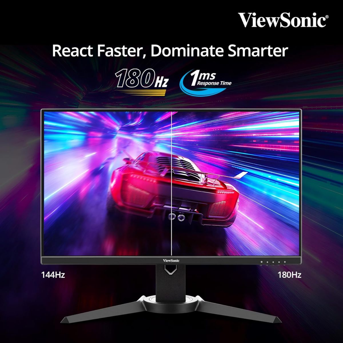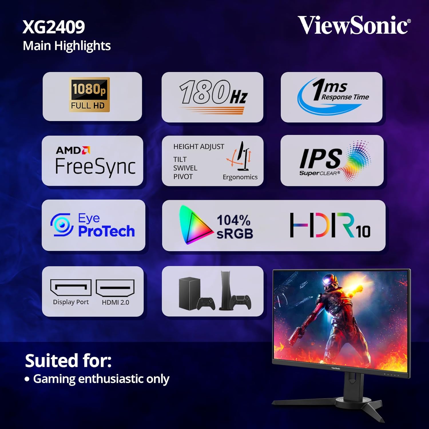 ViewSonic XG2409 60.96 cm 24 Inch FHD IPS Gaming Monitor with 180Hz, 1ms, Height Adjustment, NVIDIA G-SYNC, AMD Free Sync, sRGB104%, HDR10, Bezel-Less, Eye Care, Wall Mount, Game Mode, HDMI, DP, VGA