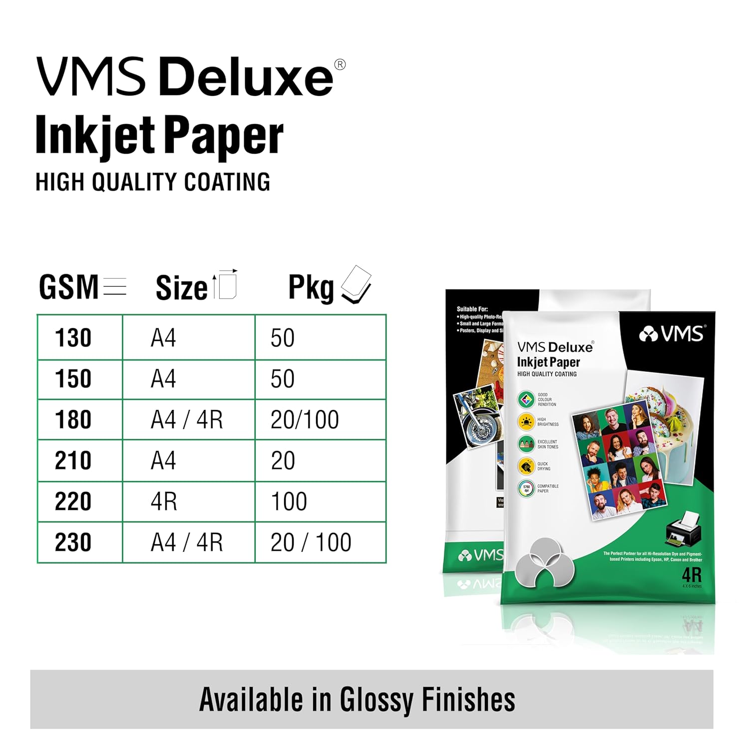 High Glossy white 180 GSM 4R(102x157mm) Photo Paper is CC(Cast Coated) and water resistant. Brilliant and full color output with perfect color saturation. Quantity : 200 sheets