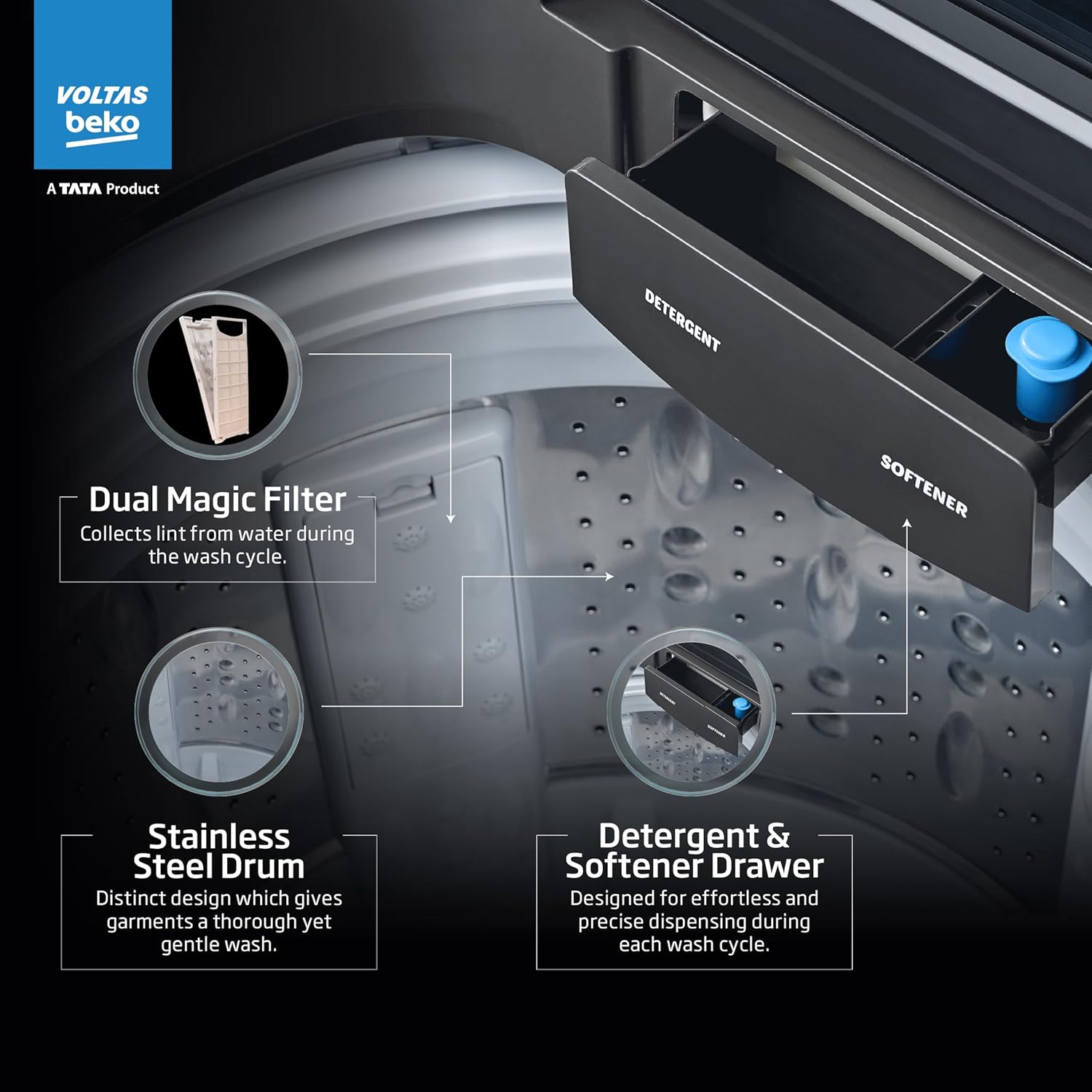 The Magic Filter collects lint and small particles from clothes during the wash cycle. It helps keep the water clean and prevents dirt from sticking back to clothes. This makes your laundry more effective and the drum easier to maintain.