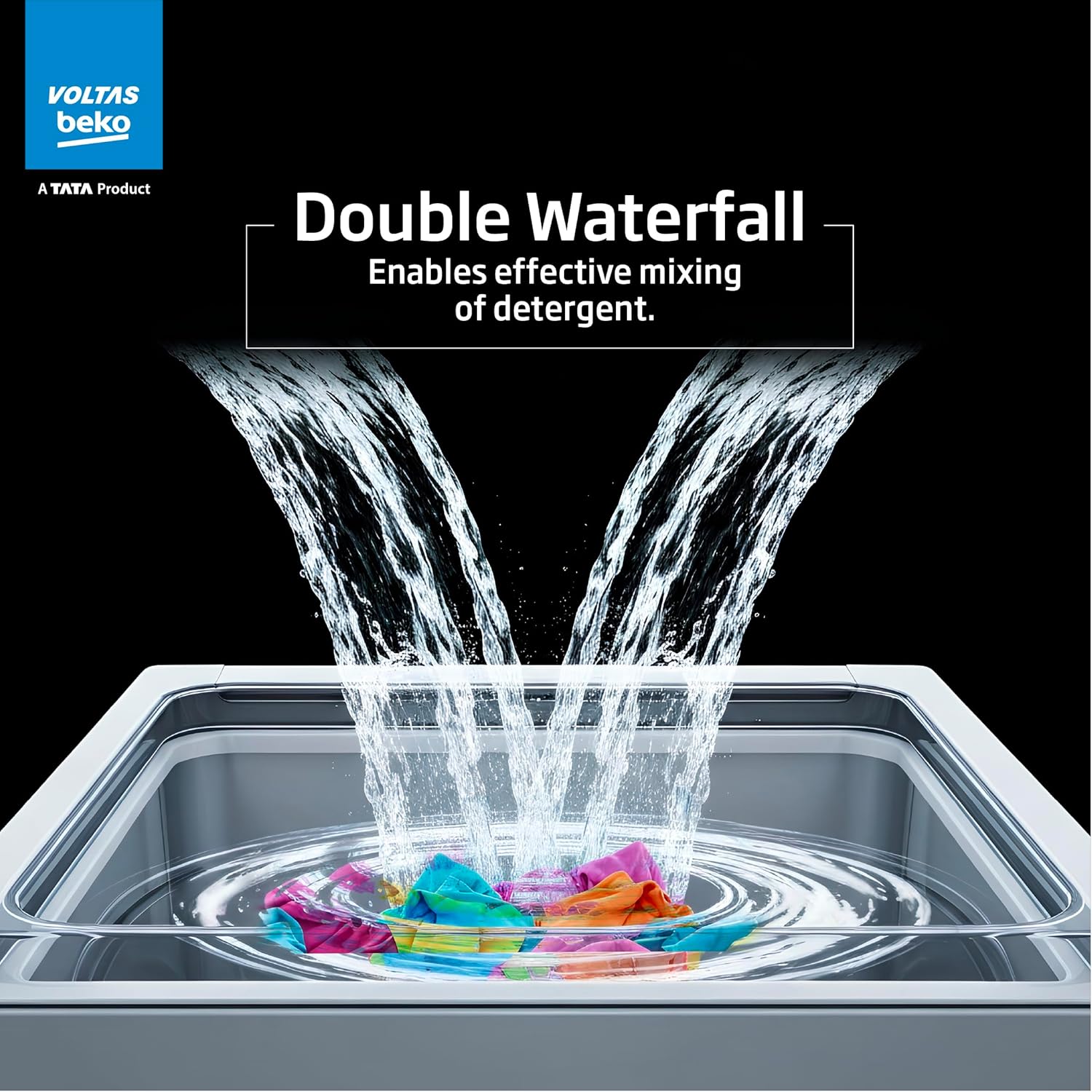 The Double Waterfall feature uses two water streams to spread detergent evenly and rinse clothes better. It helps improve washing by covering more area inside the drum, making sure clothes get cleaned thoroughly and gently.