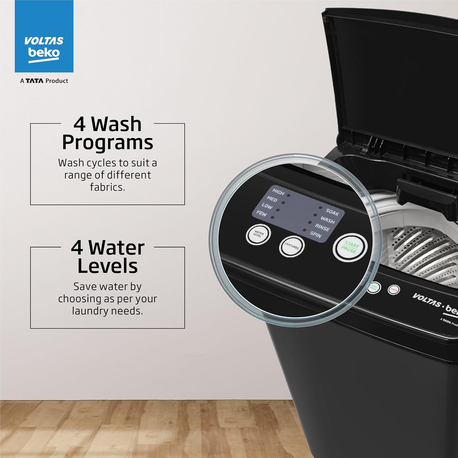 Wash Programs: 4-wash programs (SOAK, WASH, RINSE, SPIN); wash cycle suits a range of different fabrics