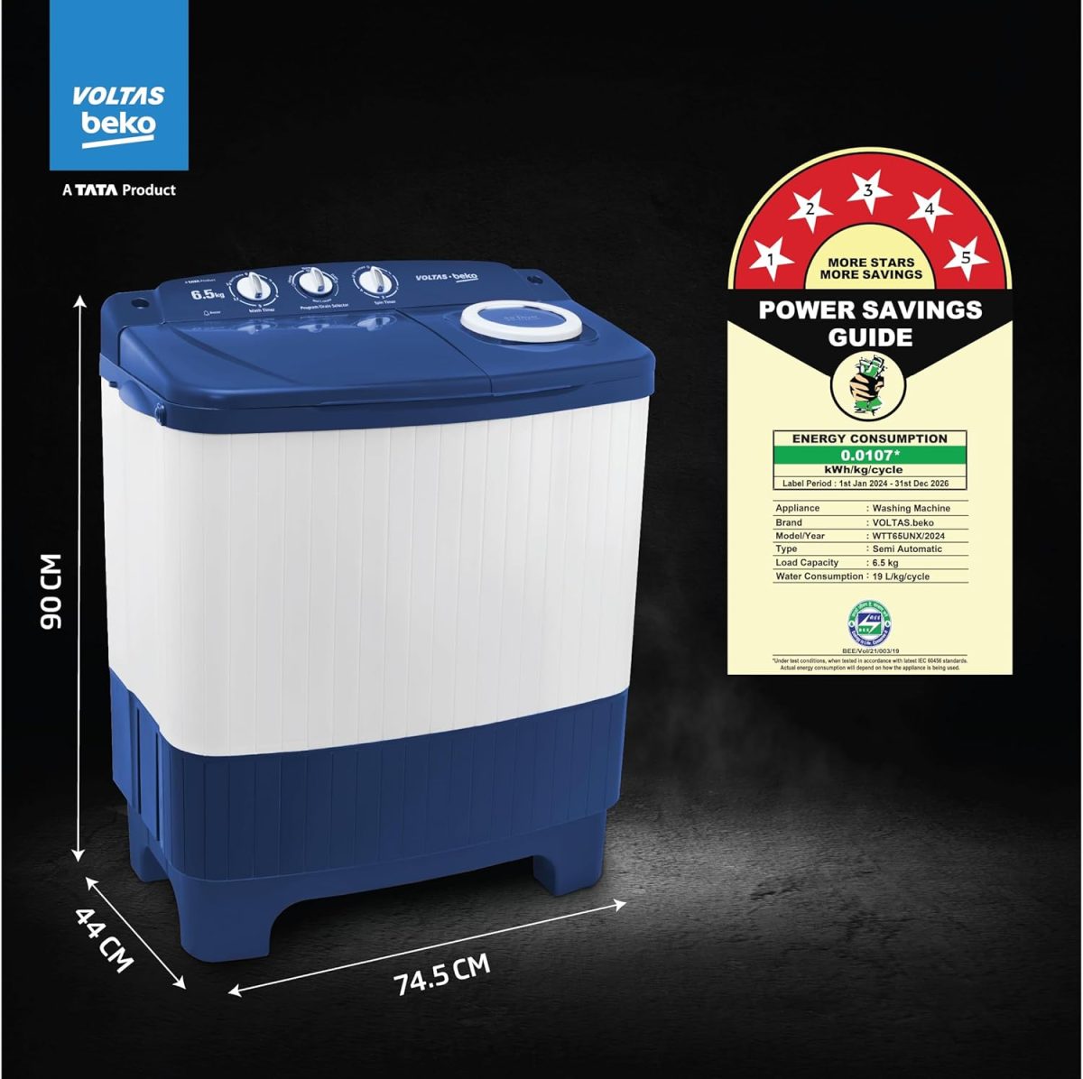Semi-automatic Washing Machine with Pure Stream Pulsator wash technology: Economical, Low water and energy function, involves manual effort; Has both washing and drying functions Capacity-6.5 kg: Suitable for small families Energy Star rating: 5 Star best in class efficiency; Energy consumption – 0.0107 KWh/kg/cycle & Water Consumption: 19 L/Kg/Cycle (Please refer BEE label for more information) Manufacturer Warranty: 1 year on product & 5 Years on motor 1350 RPM: Higher spin speeds helps in faster wash and drying Wash Programs: 3-wash programs (Gentle, Normal & Heavy); wash cycle suits a range of different fabrics Drum / Pulsator type & Body material: Plastic body, Special Pulsator & Plastic drum providing durability, rust resistance, and a gentle surface for clothes during washing Display Type: Panel Information – Water selector, Wash timer, Wash selector, Drain selector, Spin timer | Included In The Box: 1 Semi-Automatic Washing Machine, 1 Inlet Hose, 1 Drain Hose, 1 Snap Ring, 1 User Manual | Pressure Suitability: Should be less than100 kPa (1kgf/cm²)* Key Performance Features: PureStream Pulsator wash, lint Filter, 3 Wash Program, Air Dry Additional Features: Water level adjuster, Rodent control base structure, Durable body