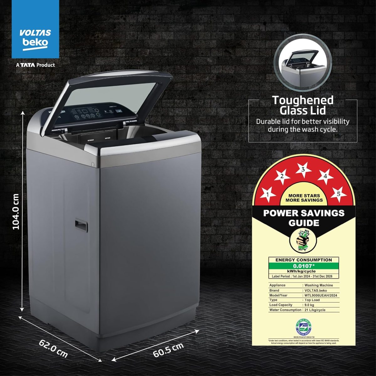 Voltas Beko, A Tata Product 9 Kg 5 Star Fully-Automatic Top Loading Washing Machine with Anti-Bacterial wash Technology (WTL9006UEAH / OBS3060, Dark Grey, Inbuilt Heater)