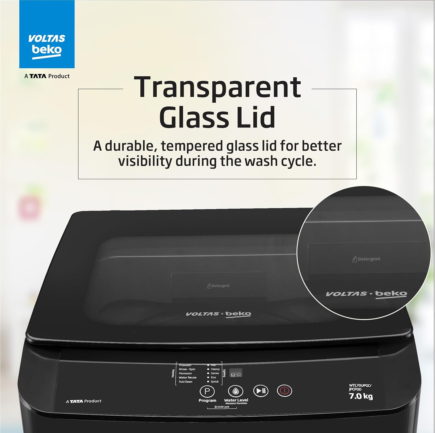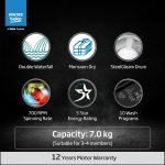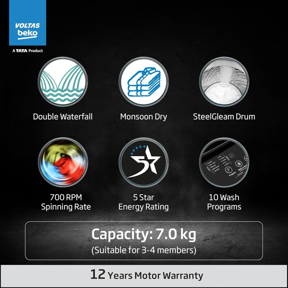 Fully-automatic top load washing machine with Monson dry and Eco Wash technology: Affordable with great wash quality, Easy to use; Has both washing and drying functions Capacity-7 kg: Suitable for 3 – 4 members Energy Star rating: 5 Star Manufacturer Warranty: 3 years on product and 12 years on motor, T&C apply 700 RPM: Higher spin speed helps in better water extraction from the clothes during the spin cycle, resulting in faster drying Wash Programs: 10 wash program – Prewash, Rinse-Spin, Monsoon, Water Reuse, Tub Clean, Mix, Heavy, Saree, Eco, Quick Drum / Pulsator type & Body material: Plastic body & Stainless-steel drum providing durability, rust resistance, and a gentle surface for clothes during washing. Display type: LED icon Display; user-friendly operation of the washing machine Key Performance Features: Auto Restart, Unique drum pattern, soft closing lid, Monsoon Dry, Tub clean Additional features – Magic Filter, Child Lock, Auto Balance Detection, Rat mesh