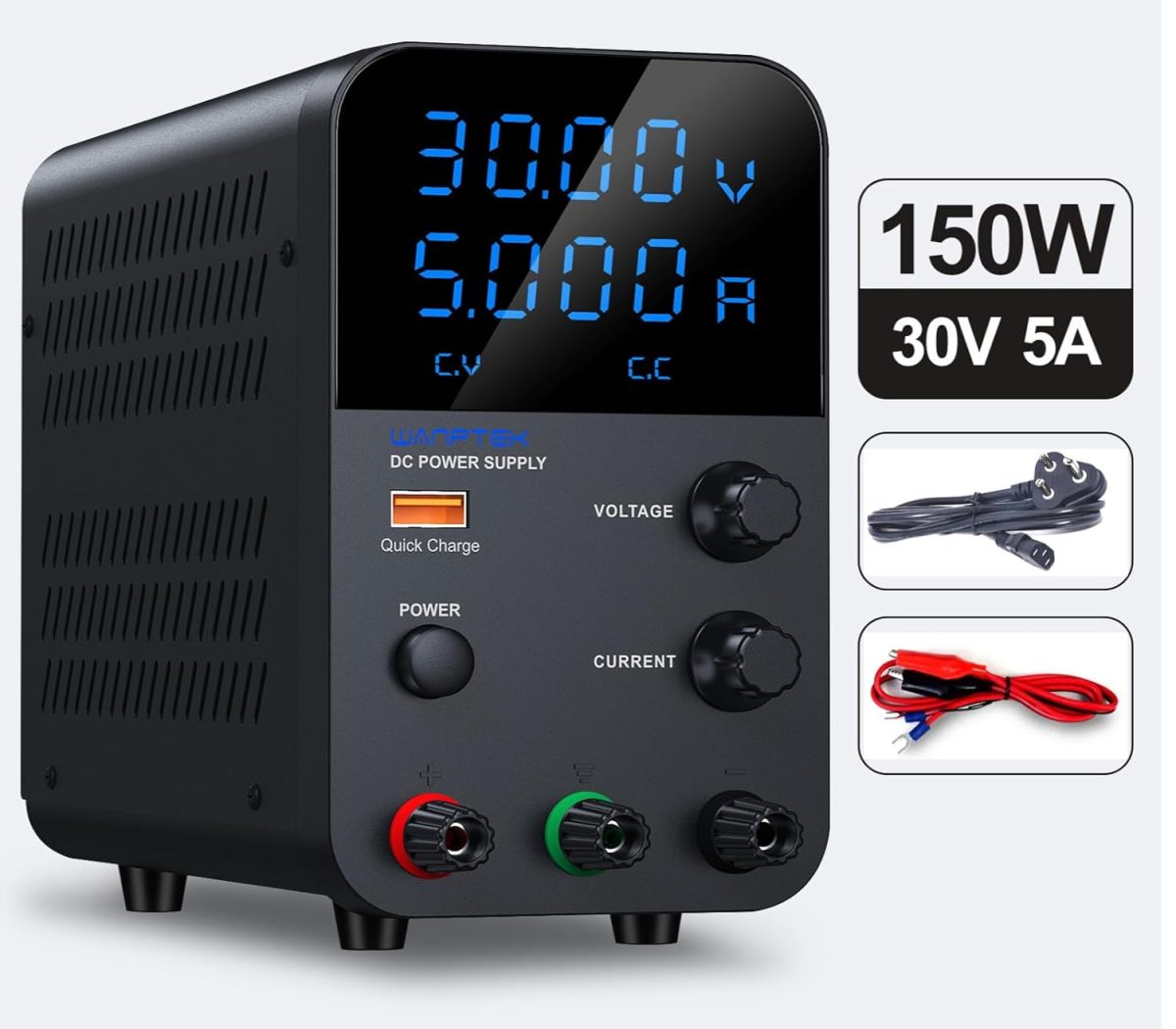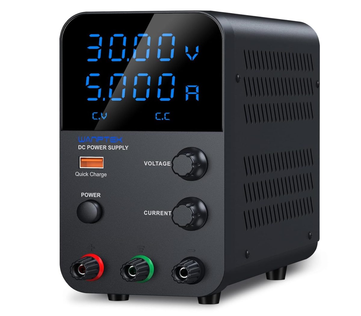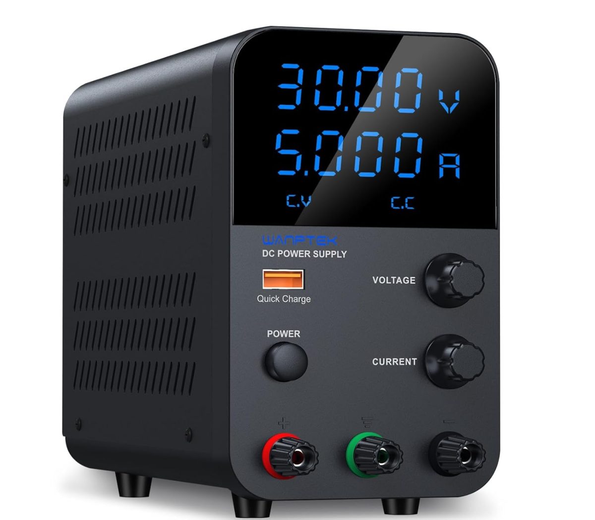 The WANPTEK GPS305D represents a high-precision programmable switching DC variable power supply. It is quipped with a dual window four-digit blue LED display for both voltage and current with seamless adjustments. Ranging from 0 to 30V for voltage and 0 to 5A for current, the system enables continuous fine-tuning using the coded encoder knob. Pre-displayed set values streamline adjustments, while a simple press of the knob switches each digit within the 0 to 9 range, ensuring highly precise voltage and current adjustments.
